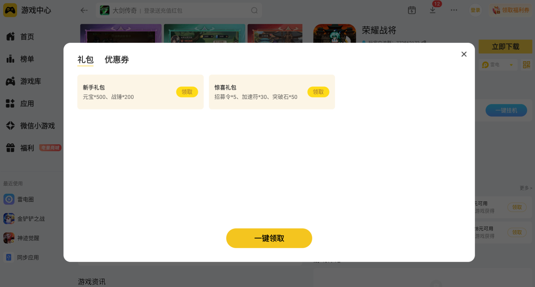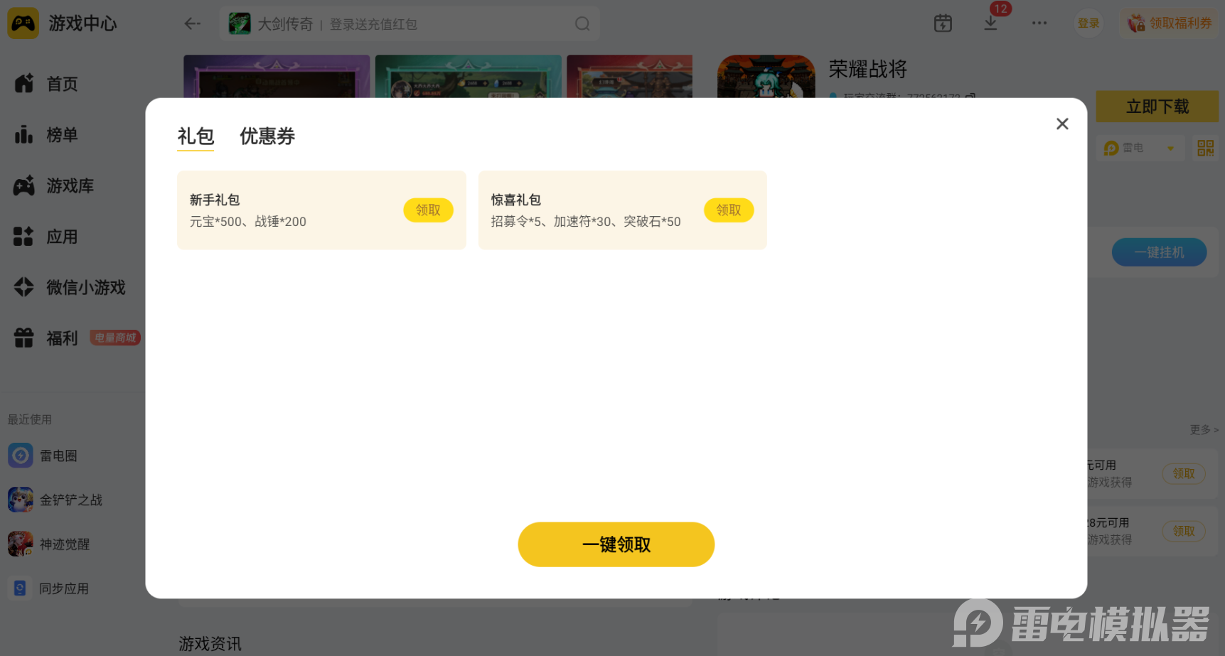 荣耀战将日常养成武将、进阶装备提升战力,都需要各类游戏道具和福利资源加持,雷电模拟器专门适配这款手游专属福利通道,整合游戏全平台各类新手礼包、进阶礼包和赛季专属福利,登录模拟器游玩游戏就能直接一键领取所有礼包资源,不用反复切换渠道查找,轻松集齐养成所需全部物资。