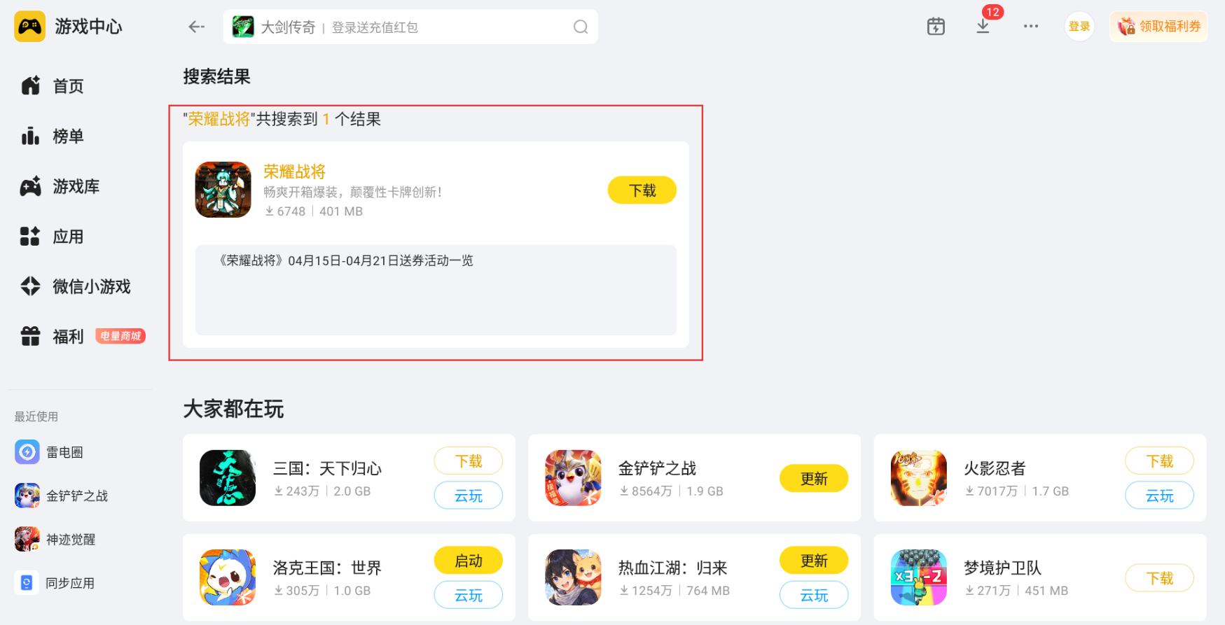 大家先在电脑浏览器搜索雷电模拟器官网,下载安装完成后打开模拟器主界面,在模拟器内置雷电游戏中心搜索栏输入荣耀战将,点击下载即可,安装完成就能直接点开游戏进入游玩状态。