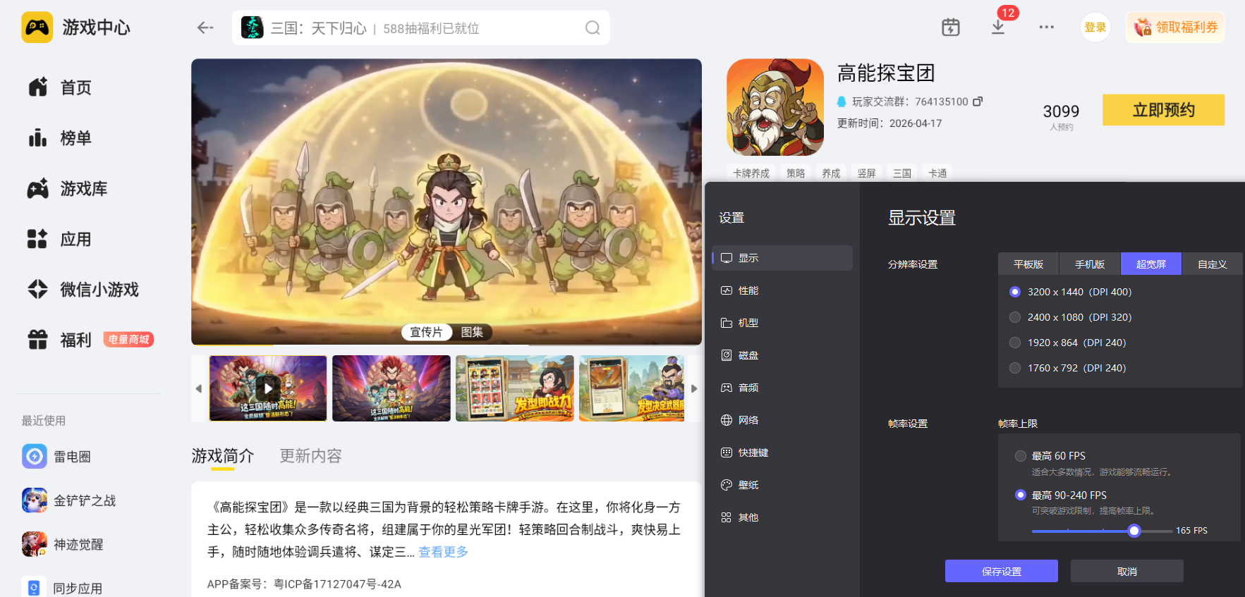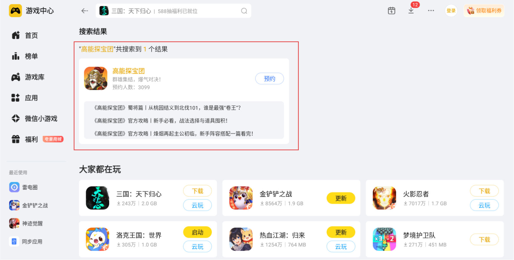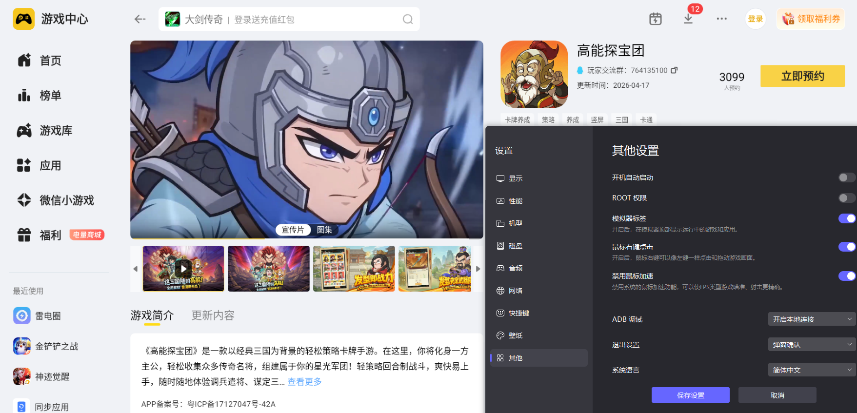 高能探宝团主打随机奇遇闯关、武将阵容搭配和多副本挑战玩法,游戏内需要频繁调整武将站位、搭配阵营羁绊,还要应对各类秘境探索和关卡抉择。结合这些核心游玩内容,选择在电脑上用雷电模拟器运行高能探宝团,能完美适配游戏所有玩法运行需求让整体游玩过程更贴合游玩习惯。大家只需要在官网下载雷电模拟器,然后在雷电游戏中心预约该游戏,然后等待游戏上线即可。