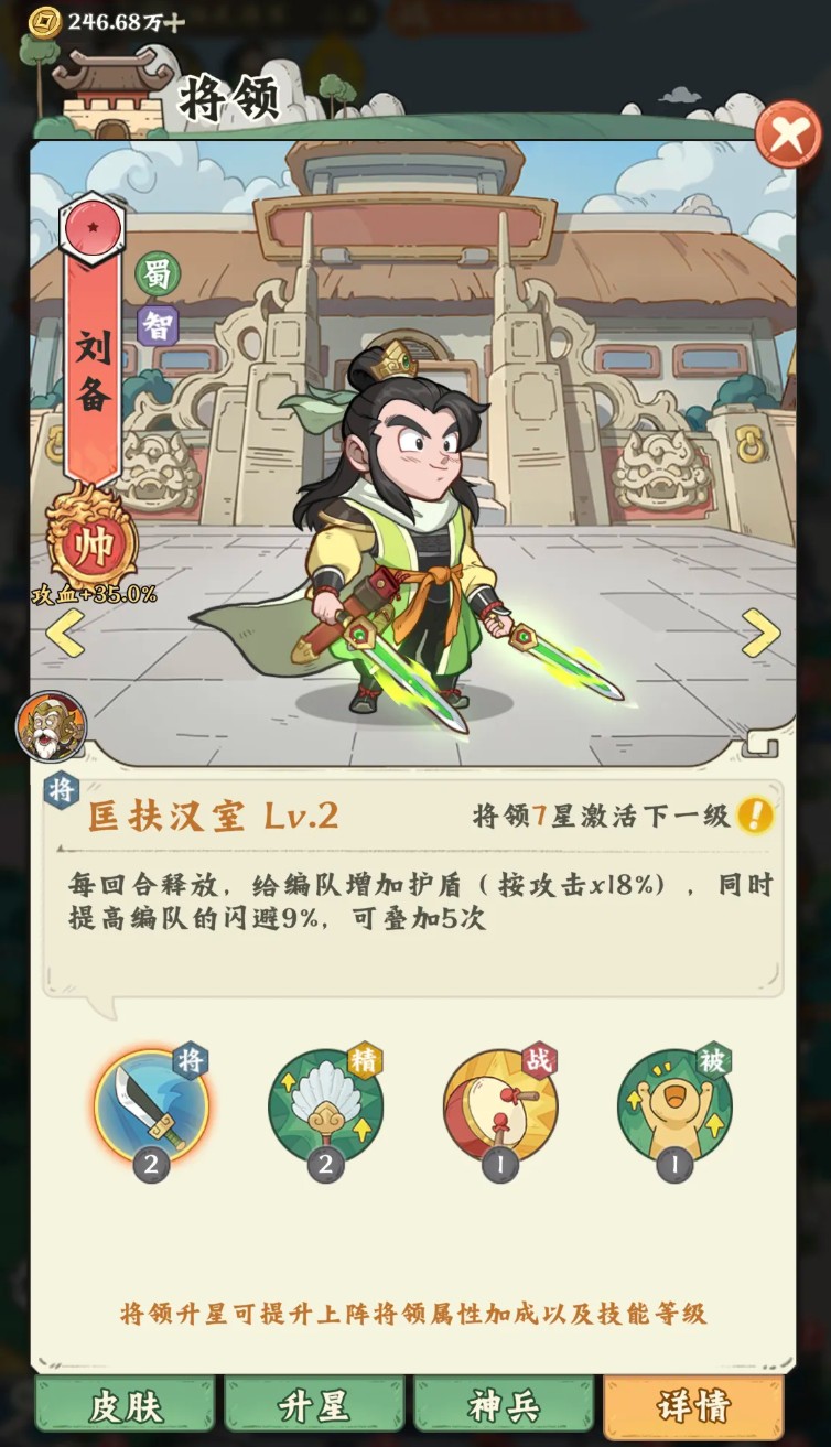 新手优先选用易获取的武将组合,以刘备为核心搭建队伍,怒气技能选择桃园结义,战法主点鼓舞。推荐两套实用配置,一套搭配关羽、张飞、赵云、姜维,姜维自带复活效果,队伍闪避属性突出,玩家对战时优势明显。另一套搭配关羽、张飞、夏侯惇、鲁肃,可快速堆叠鼓舞被动,闯关推图的效率更出众。两套阵容均以暴击与闪避为核心,张飞可提升队伍暴击率,兼顾输出与生存能力。