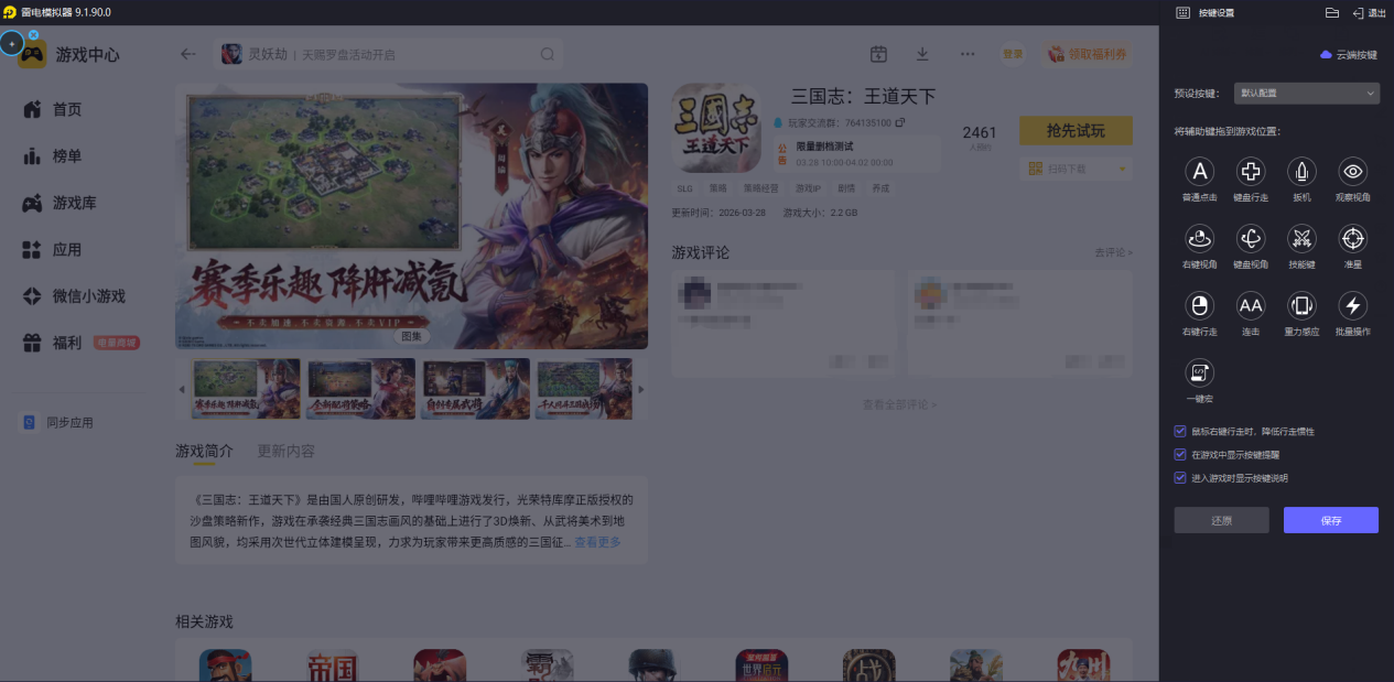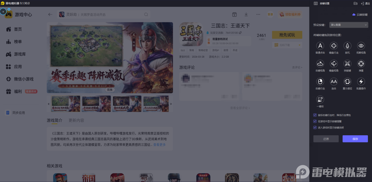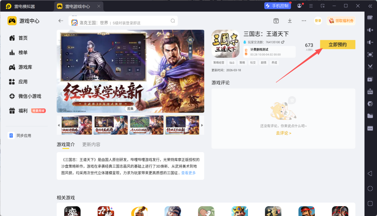 进入模拟器后打开雷电游戏中心,搜索“三国志王道天下”,找到对应游戏后点击预约,等游戏正式上线后即可下载游玩了。