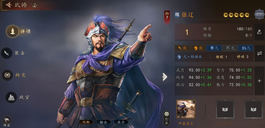 在游戏中定位为突击型骑兵武将,武力与统率成长极高,兵种适配骑兵,拥有6格移动力,战场机动性拉满。作为五子良将之首,其自带战法“冲垒逐王”具备优先锁定敌方后阵武将特性,配合突击战法可实现精准斩首战术,是拆解敌方后排核心的关键力量。