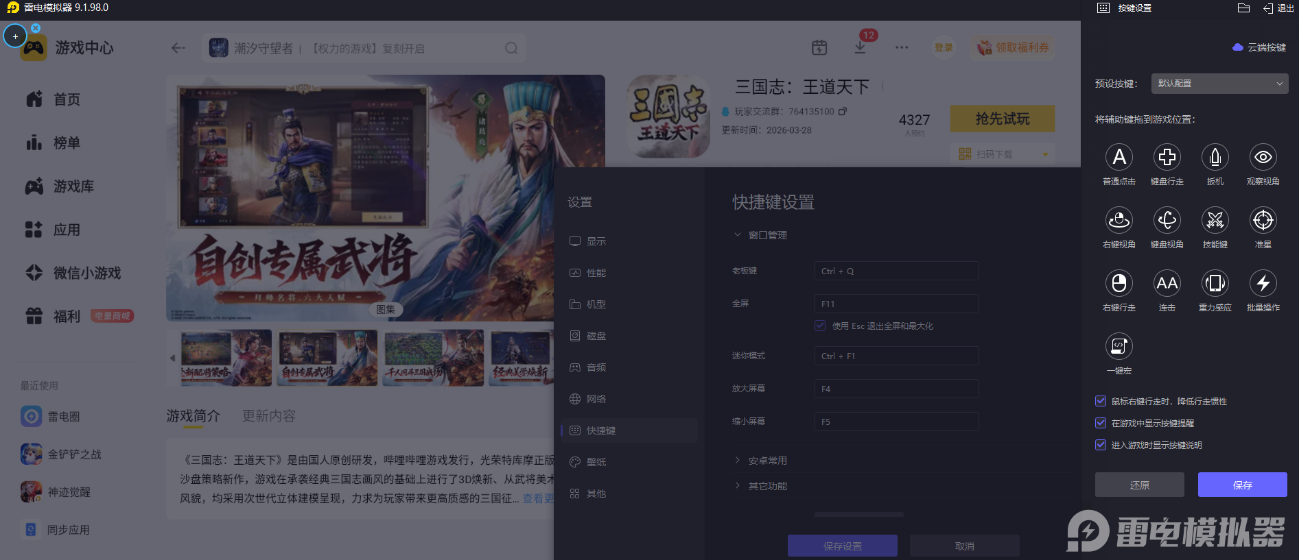 骑兵武将的核心在于机动,张辽6格移动力需要精准操作才能绕开敌方前排,手机触屏操作易出现误触,影响走位精度。雷电模拟器支持键鼠自定义映射,WASD键控制移动比触屏更灵活,可精准避开技能范围,快速调整位置锁定敌方后排,让张辽的突击战术完美执行,提升战斗效率。
