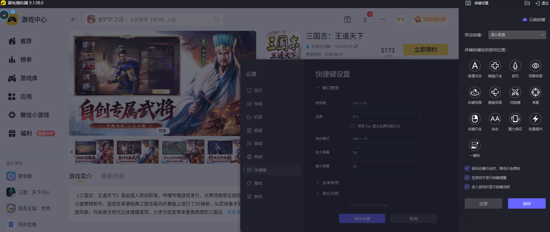 开荒过程中需要频繁进行建筑升级、武将切换、出征作战等重复操作,移动端触屏操作容易出现误触,拖慢开荒节奏。雷电模拟器支持键鼠自定义设置,可根据开荒的操作习惯,自由设定各项功能的按键位置,让每一项操作都更贴合使用需求,既能减少误触情况,又能加快操作速度,让各类开荒操作更高效。