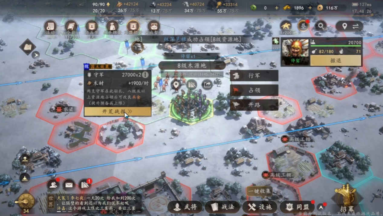 开荒初期的核心是打好资源基础,充足的资源是建筑升级和武将培养的前提。进入游戏后先领取邮箱内的系统福利,获取招募券和基础资源,随后优先升级君主殿,这是解锁更多玩法和建筑的核心。接着依次建造农田、伐木场、铁矿厂和石料场,均衡提升各类资源建筑等级,同时优先占领周边低级资源地块,扩大资源产出渠道,积攒粮草、木材等基础物资,避免后期发育出现资源短缺的情况。