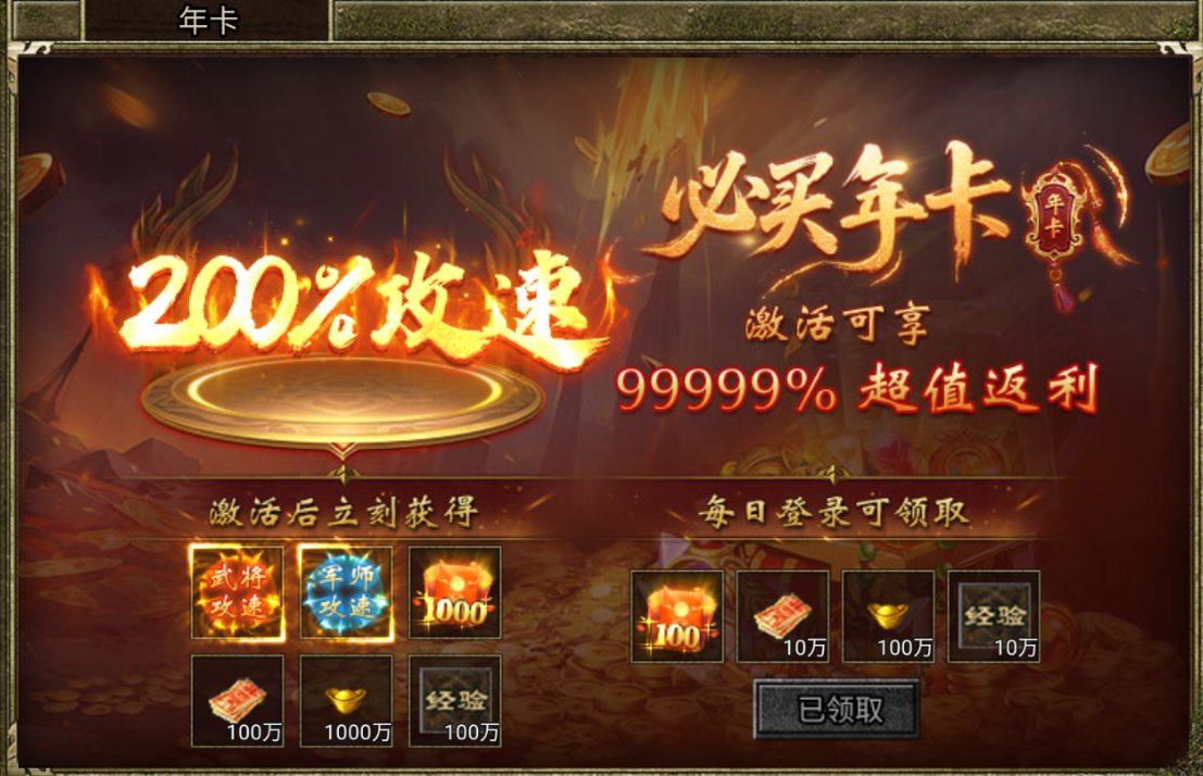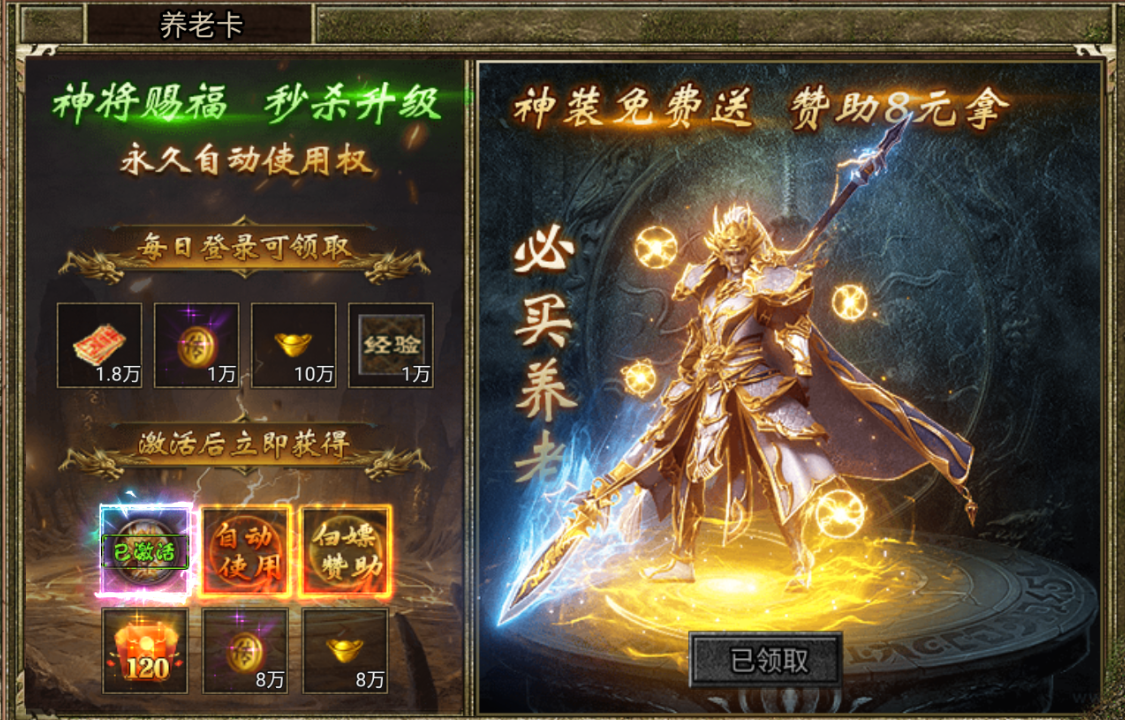 养老卡与月卡、年卡侧重于长线稳定收益,激活后每日可领取灵符、元宝、经验等资源,同时解锁自动使用等便捷功能,适合休闲玩家或轻付费用户稳步成长。月卡注重短期回报与性价比,年卡则提供持续的攻速加成与高额返利,对挂机体验提升尤为显著。