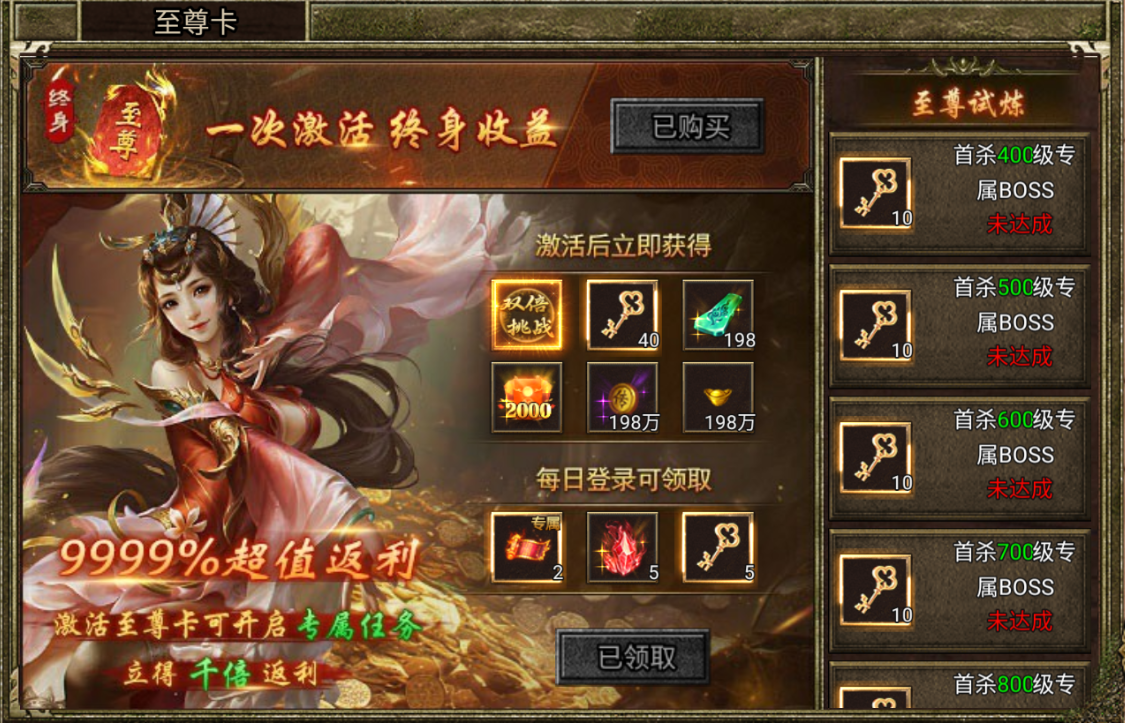 至尊卡属于高阶特权体系,激活后将开放专属个人试炼玩法,通过挑战赢取稀有材料与海量奖励,适合中后期追求战力巅峰的玩家。整体而言,卡类系统与赞助系统可根据个人投入计划灵活组合,合理搭配即可在不重复消费的前提下,实现战力与资源获取效率的双重突破。