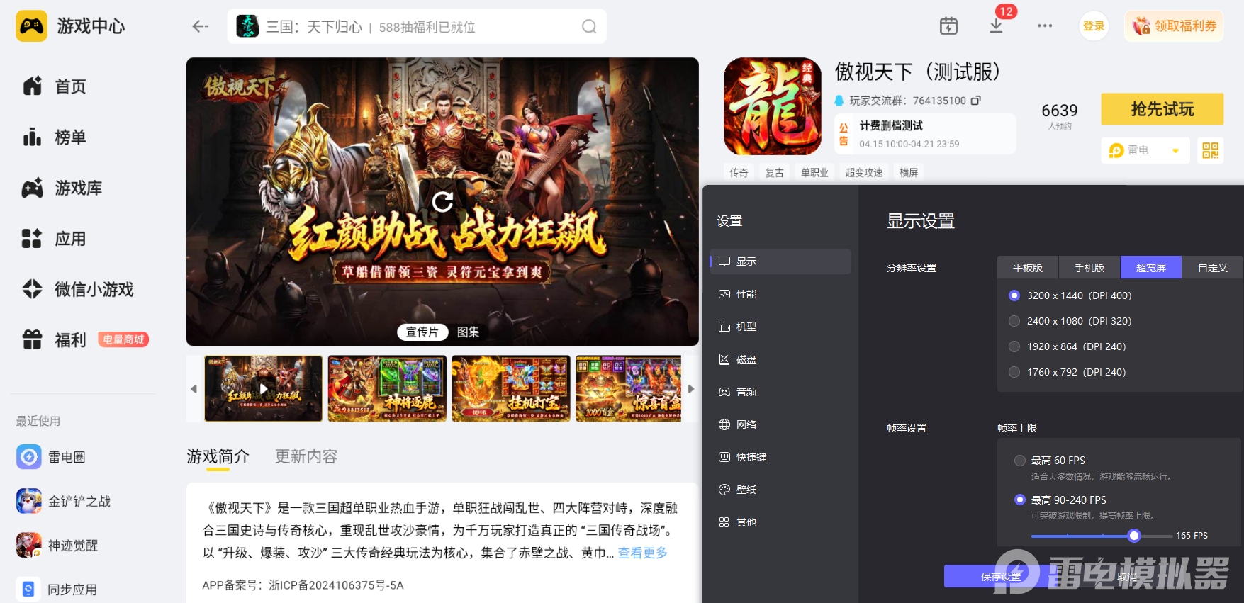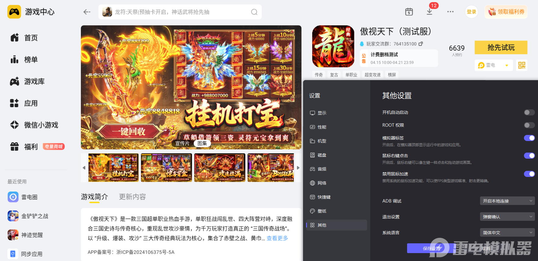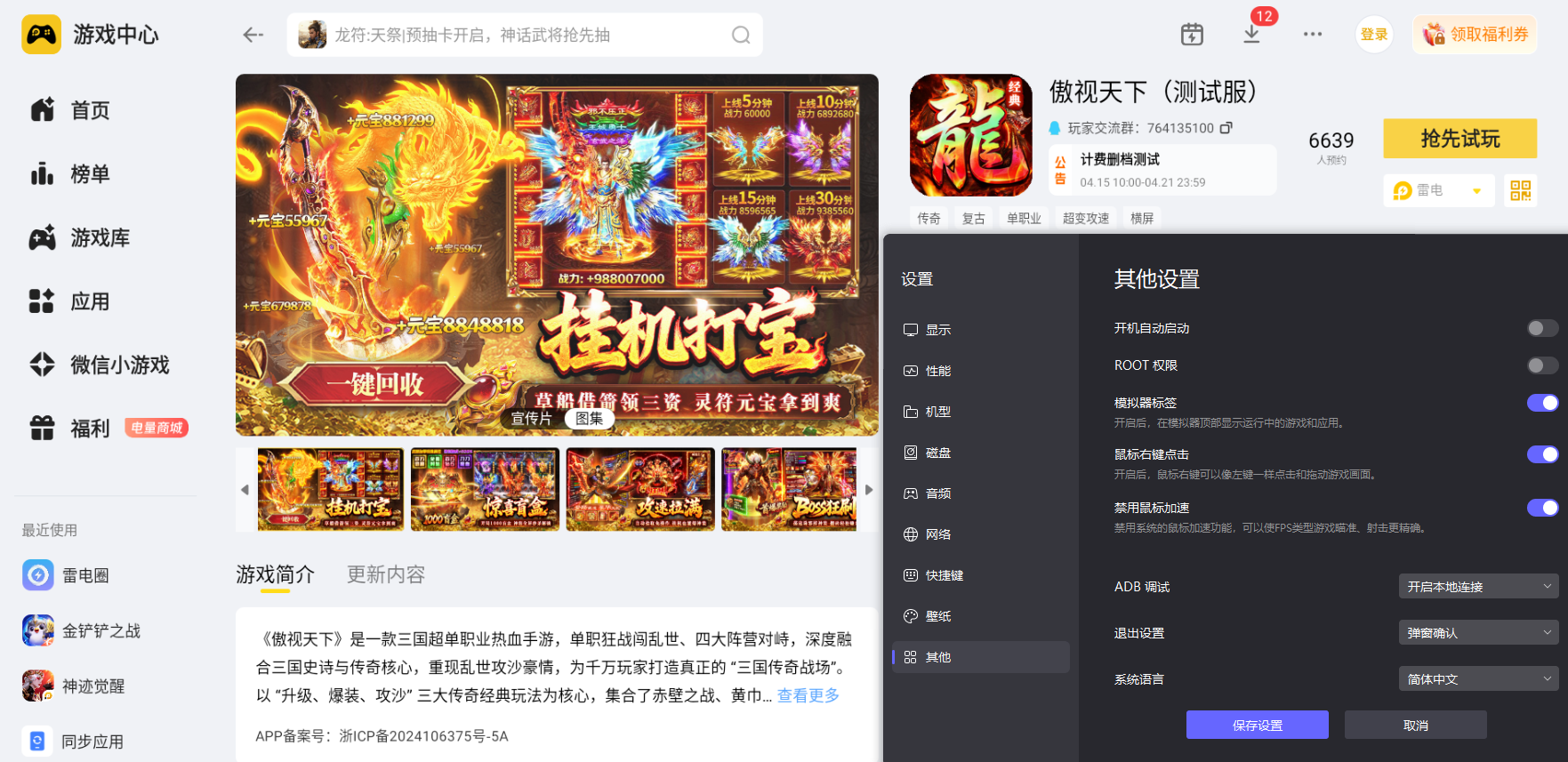 想要长久畅快体验傲视天下的三国传奇乐趣,电脑搭配傲视天下模拟器游玩是绝佳选择。不管是日常刷怪升级、打装备闯副本,还是参与跨服攻沙和三国战役比拼,都能依靠雷电模拟器,轻松玩转游戏全部核心玩法,沉浸式感受乱世争霸的游戏魅力。