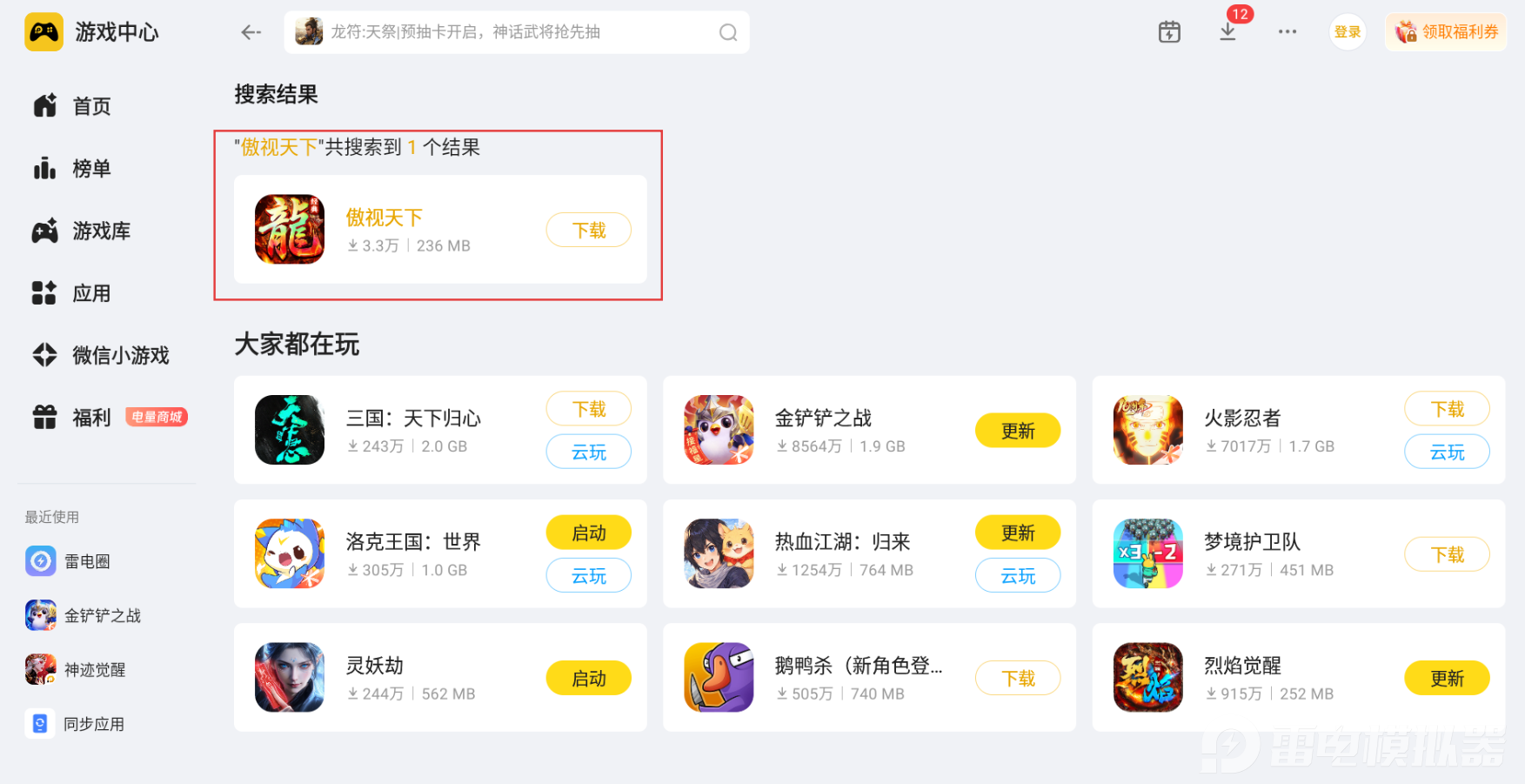 傲视天下主打单职业狂战核心玩法,日常以升级、爆装、攻沙为主要内容,还有赤壁之战、诸侯会盟等特色战役副本可以体验,长期玩需要频繁刷怪打BOSS和参与跨服对战。想要摆脱手机屏幕局限,稳稳体验游戏全部热血内容,用雷电模拟器在电脑上玩傲视天下手游就是最合适的选择,适配游戏所有玩法模式,游玩适配度特别贴合。大家只需要在官网下载雷电模拟器,然后在雷电游戏中心搜索“傲视天下”,点击下载即可。