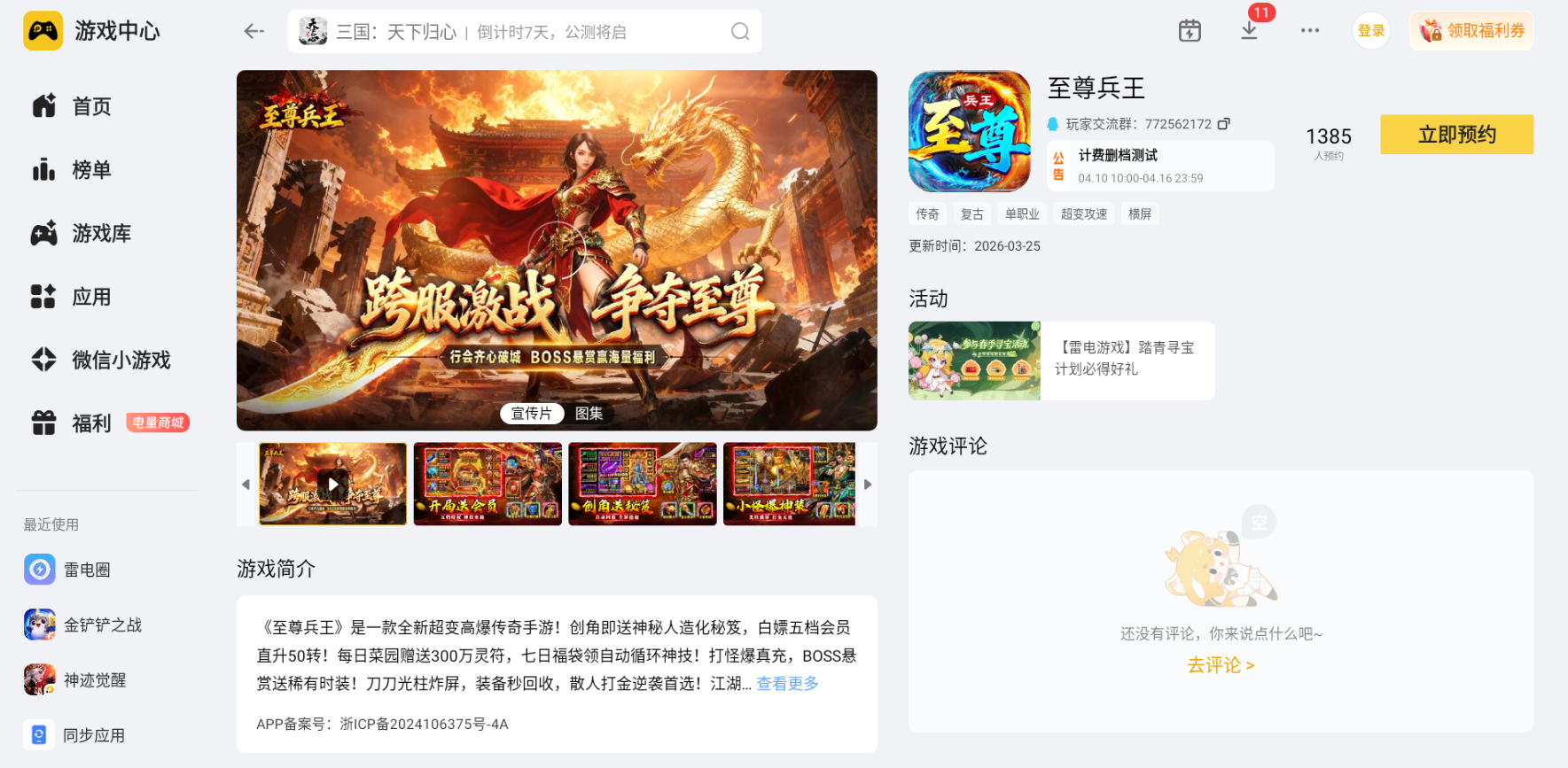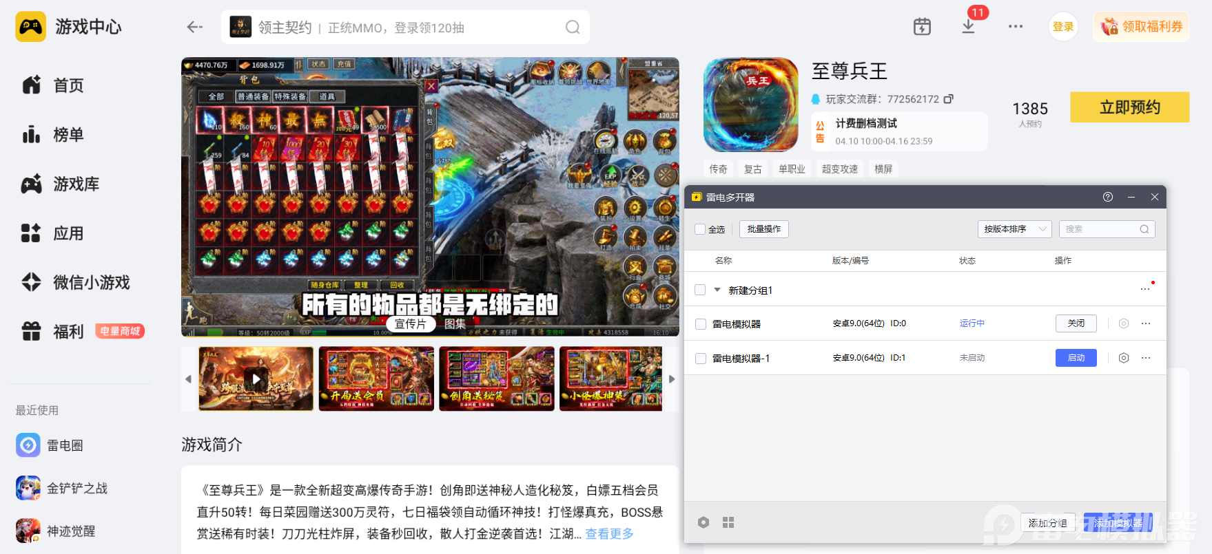 在这里,小编推荐大家选择雷电模拟器。大家直接前往雷电模拟器官网,下载对应电脑系统的安装包,然后在模拟器内的雷电游戏中心找到至尊兵王,点击对应的预约按钮,按照页面提示完成预约操作,就能提前锁定游戏上线后的电脑端游玩资格,轻松开启大屏游戏体验。