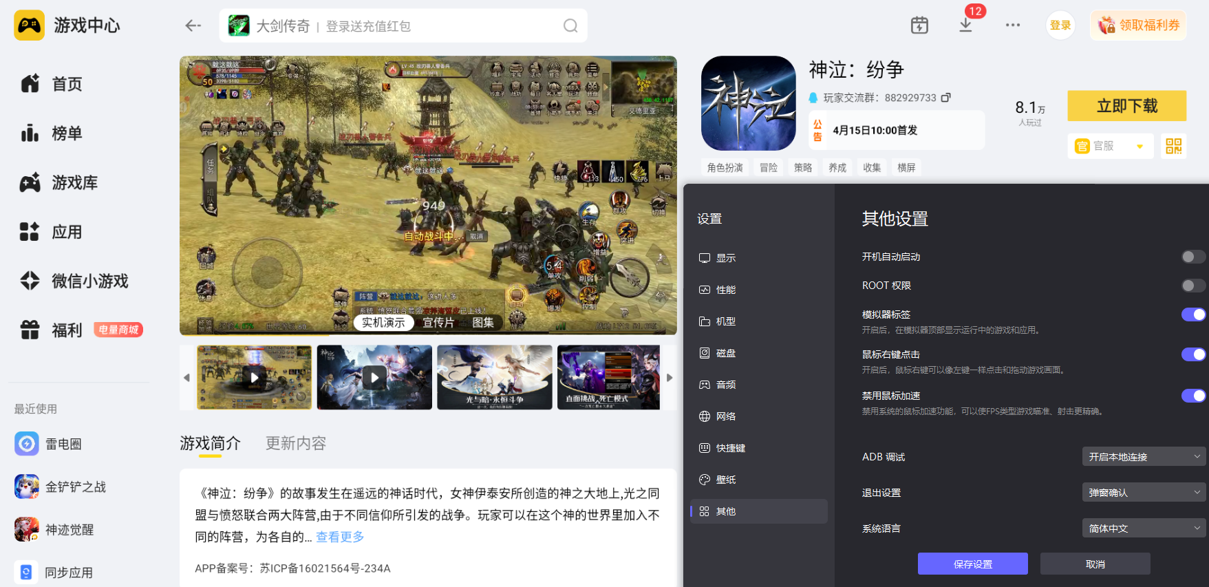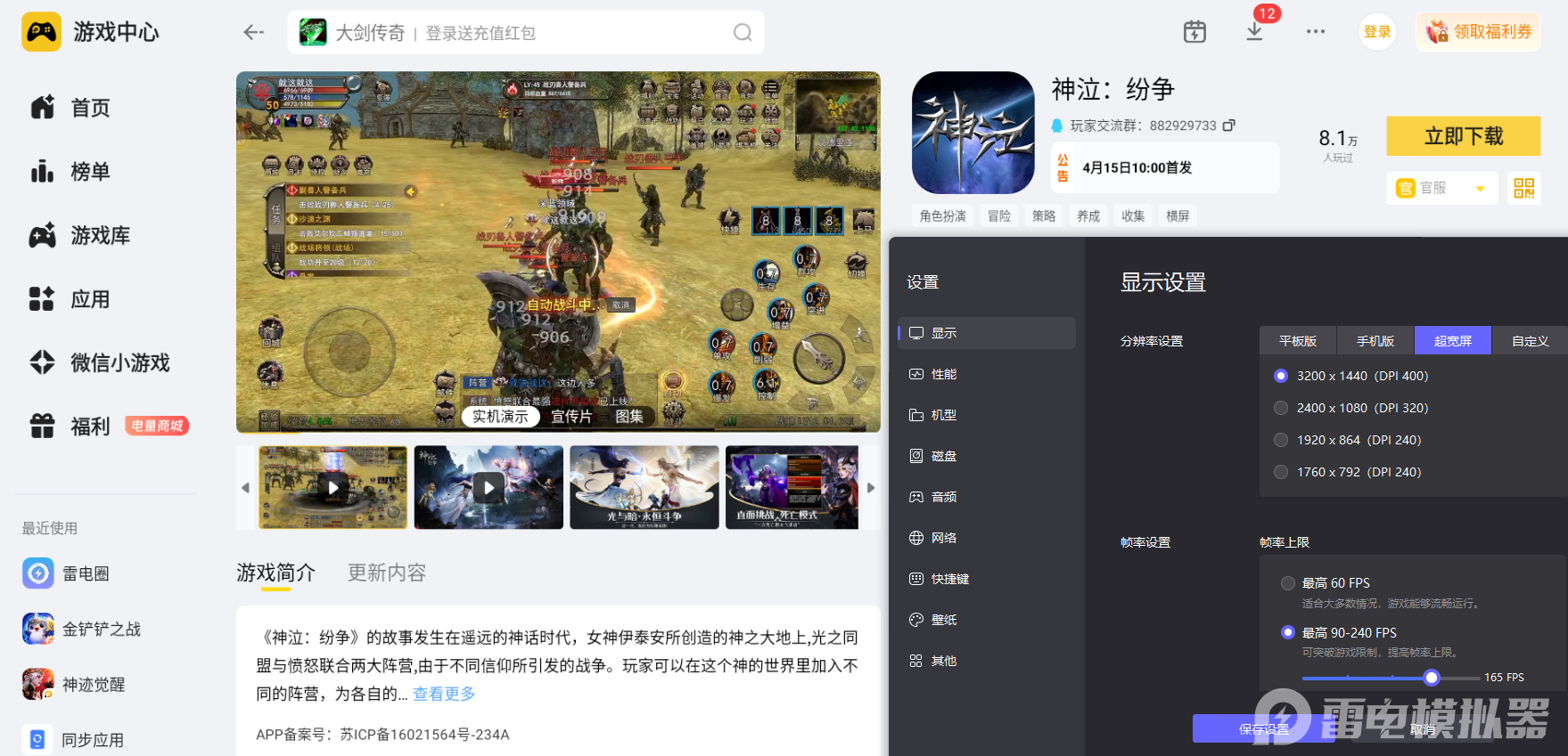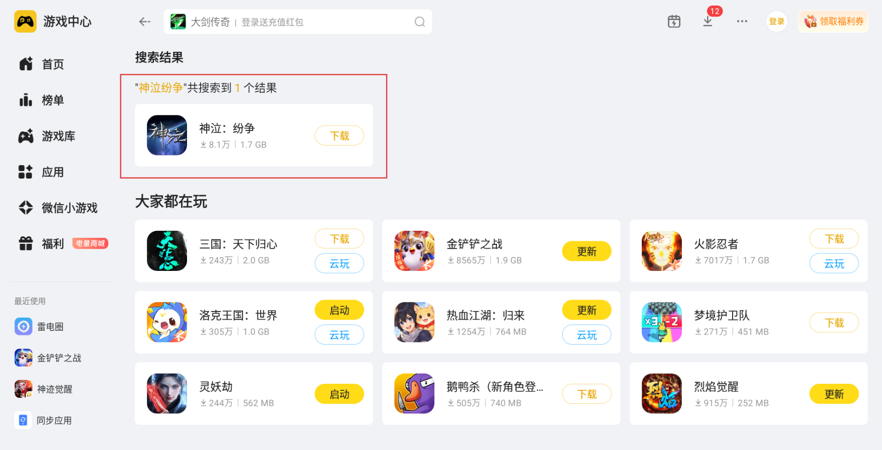 大家可以在雷电模拟器官网先下载好雷电模拟器,然后在内置的雷电游戏中心搜索“神泣纷争”点击下载,然后等待系统自动完成游戏安装,就能直接点击图标进入游戏开启冒险。