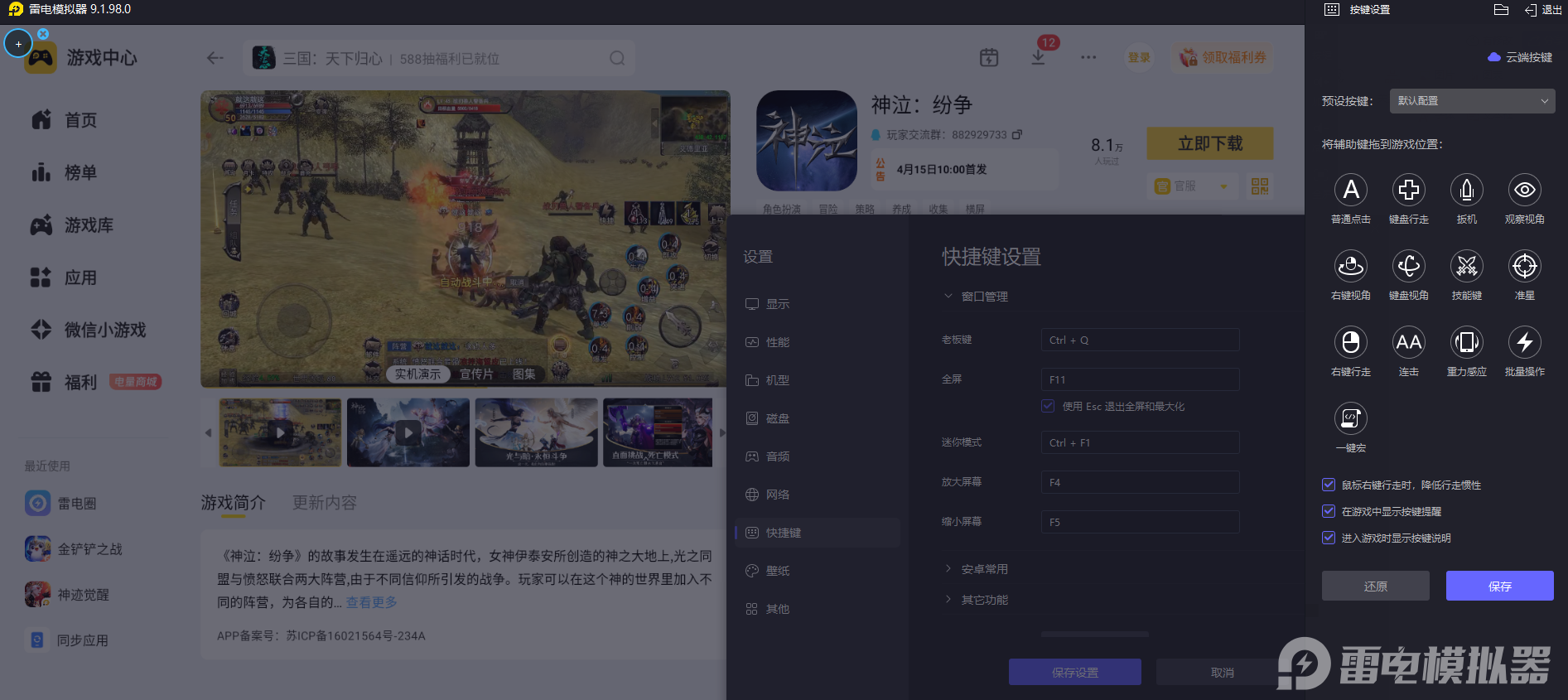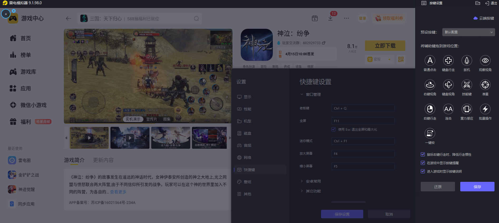 神泣纷争团战PK和副本闯关需要频繁释放技能、切换走位和调整职业操作,雷电模拟器支持全键位键鼠自定义设置,能够根据自身操作习惯搭配专属技能按键布局,适配各类职业战斗操作节奏,精准完成技能释放、走位拉扯和目标锁定,提升整体对战操作手感。