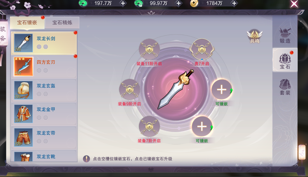 宝石功能则是装备上的镶嵌物,每件装备都可以镶嵌6颗宝石,每个镶嵌孔可以镶嵌的宝石类型不同,镶嵌的宝石等级越高,为装备增加的战力越高。当10件装备镶嵌的宝石等级达标时,将有宝石加成。