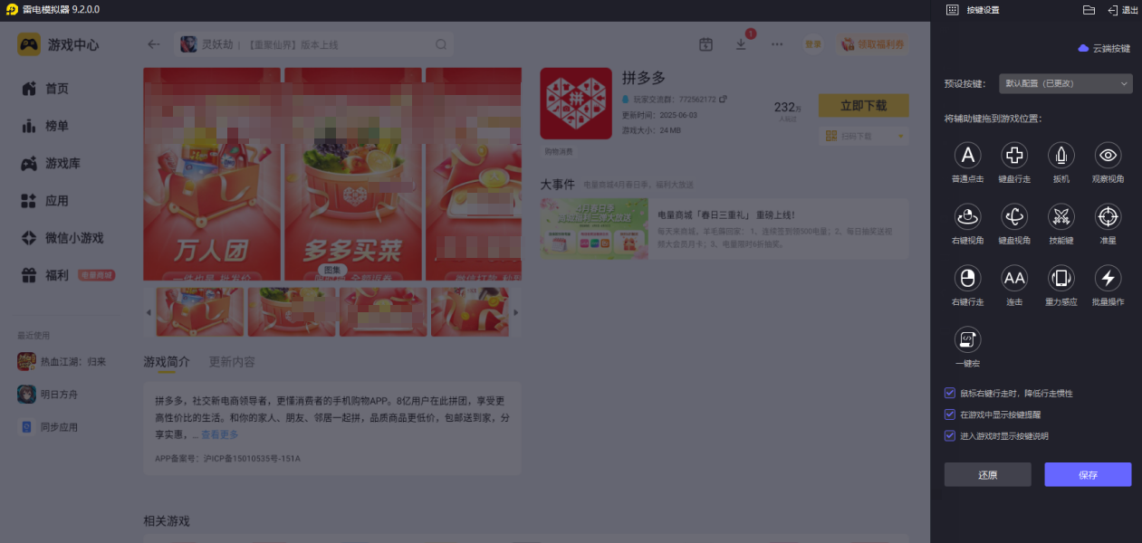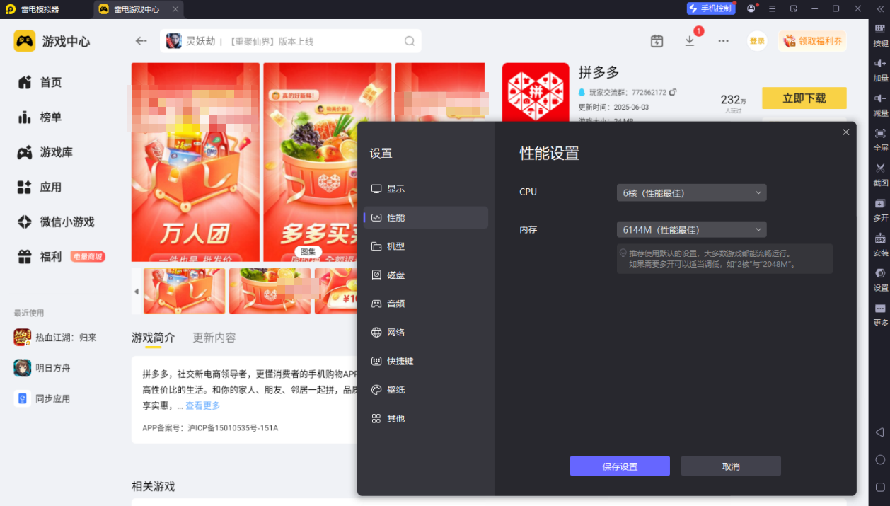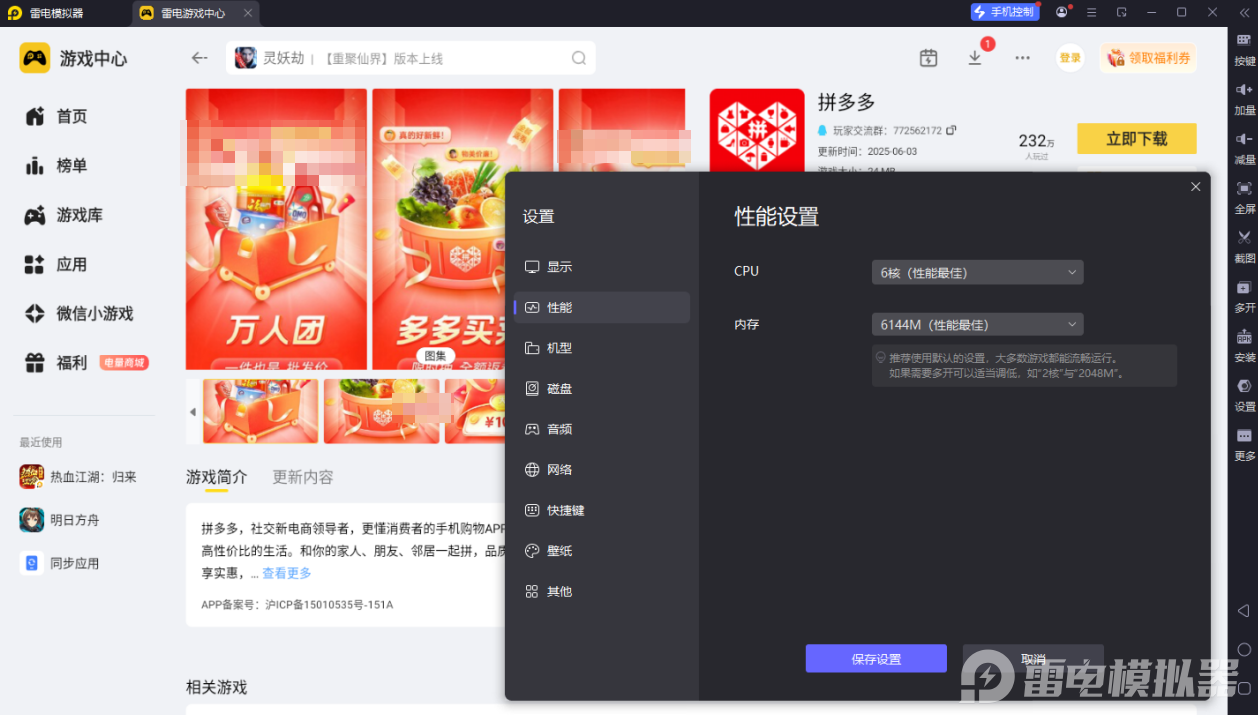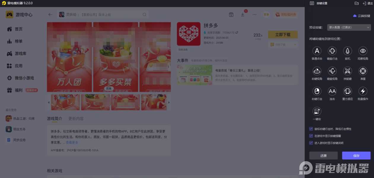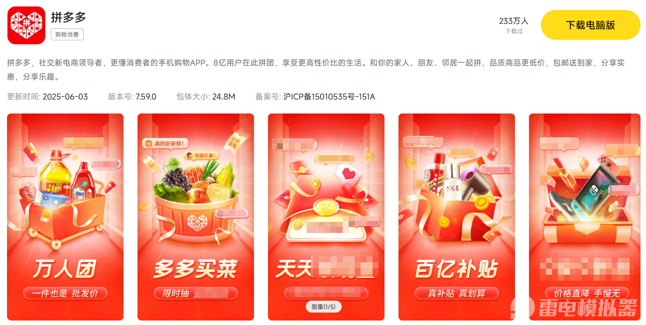 日常网购想告别手机小屏,或是工作需要批量打理店铺、高效比价,拼多多电脑版都是理想选择。市面上适配拼多多的模拟器不少,但不少存在卡顿闪退、适配差的问题,选对工具才能解锁顺畅的电脑网购体验,而雷电模拟器就是运行拼多多电脑版的优质工具,能带来稳定流畅的使用体验。