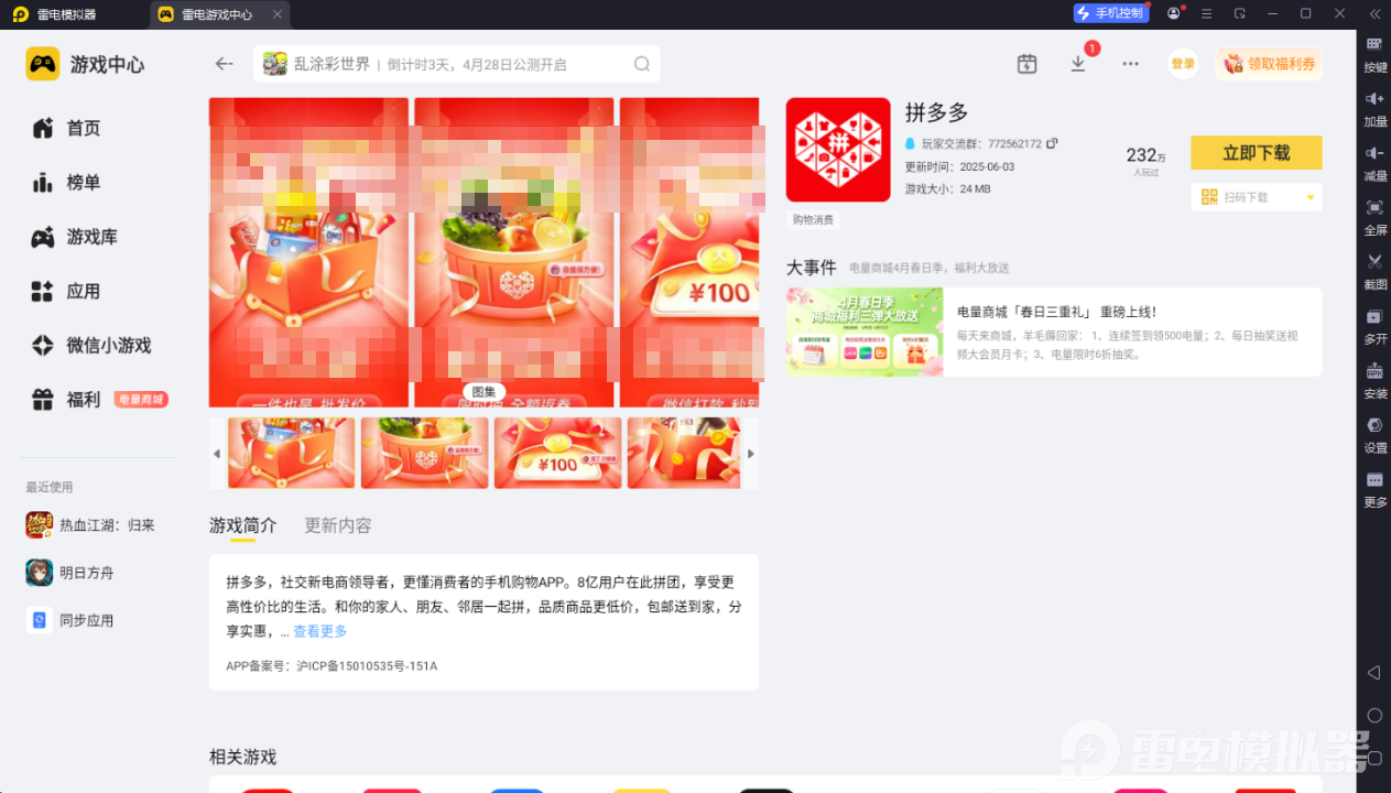 安装后打开模拟器,进入 “雷电游戏中心” 搜索 “拼多多”,找到官方应用点击下载,系统自动安装。完成后在应用列表找到拼多多图标,双击就能启动使用。