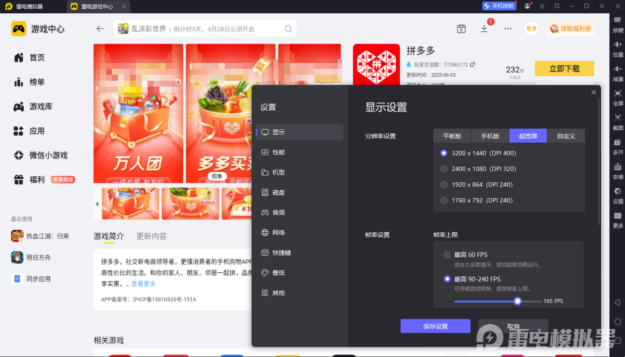雷电模拟器高清大屏体验出色,支持自定义高清分辨率,能清晰展示拼多多商品细节,告别手机小屏模糊感,长时间浏览不易视觉疲劳。不管是查看商品详情页还是对比多件商品,都能一目了然,购物体验更舒适。