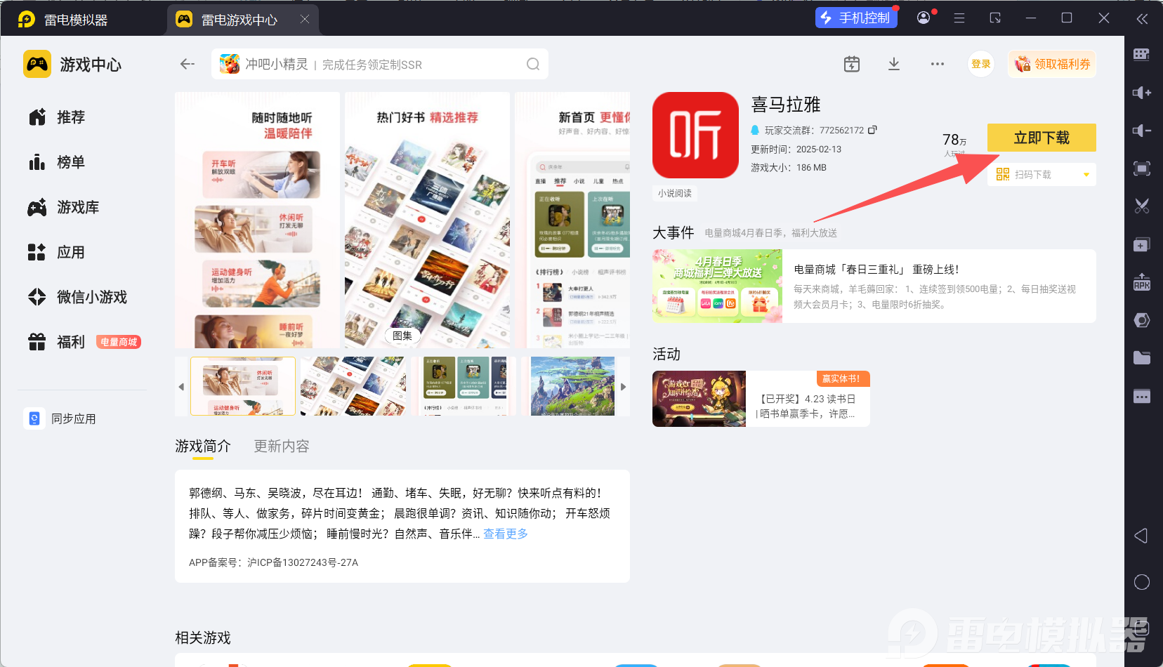 很多人习惯在手机上听音频,但如果长时间听小说、课程或播客,手机屏幕小、电量消耗快的问题就会慢慢显现。这时不少用户会搜索喜马拉雅电脑版,希望在电脑上获得更稳定、更舒适的听书体验。借助雷电模拟器在电脑上安装并运行喜马拉雅电脑版,就能轻松实现大屏听书、键鼠操作以及后台播放等体验。