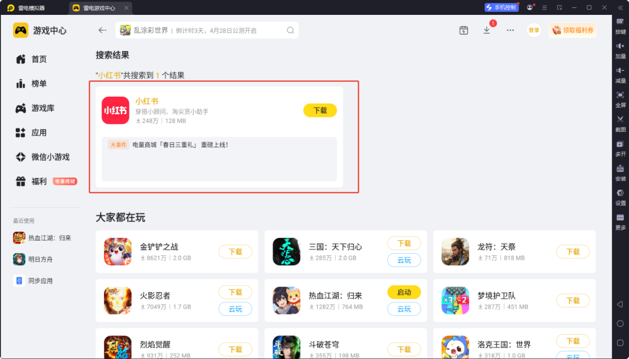 打开模拟器后,在 “雷电游戏中心” 搜 “小红书”,找到对应的应用后,点击 “下载”,系统会自动完成下载安装。安装完成后在模拟器的应用列表中找到小红书图标,双击就可以启动使用了。