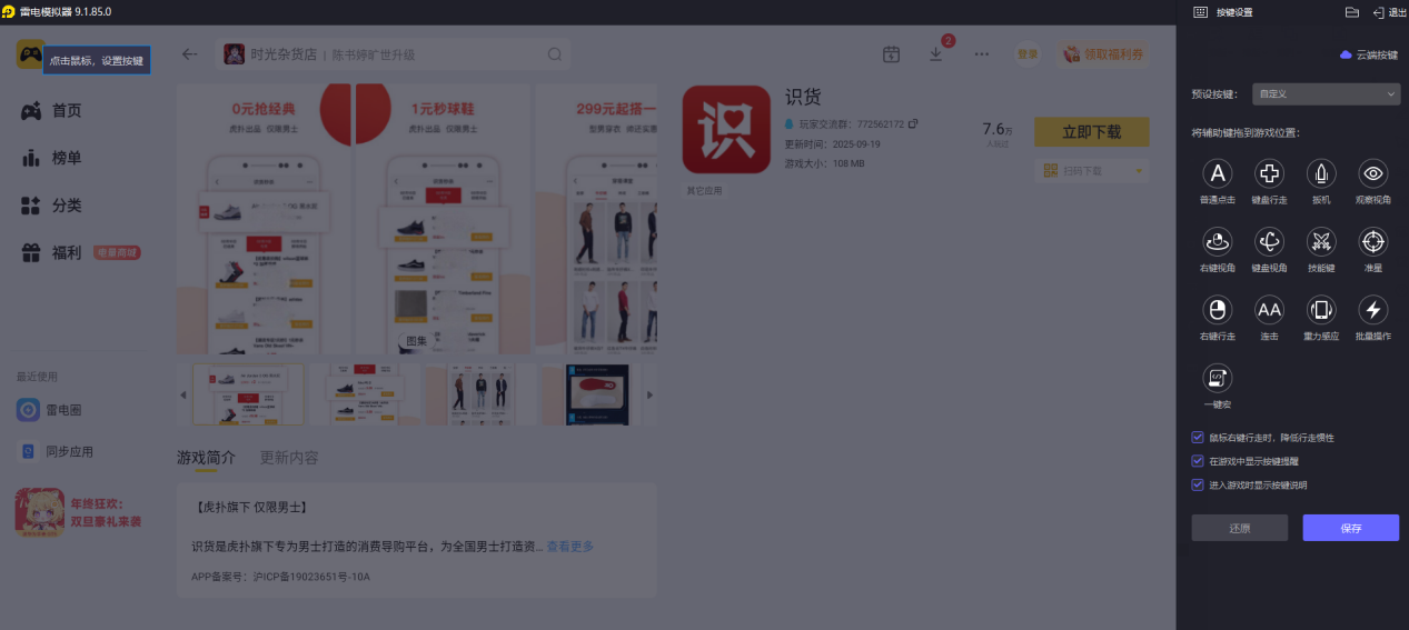 用雷电模拟器打开识货app,操作特别简单。可以自定义键盘和鼠标按键,比如把“搜索”“加入收藏”设置成快捷键,不用像手机那样触屏点击,反应更快。而且鼠标控制浏览页面,滑动、点击都很精准,查看商品详情、对比多个链接时,不用反复缩放屏幕,操作效率大大提高,新手也能快速上手。