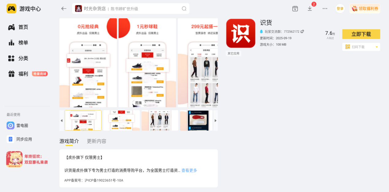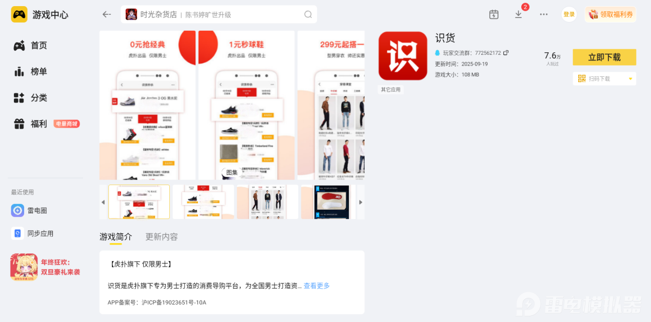 想体验识货电脑版,用雷电模拟器是靠谱的选择,既不用复杂操作,又能享受优质体验。大家可以去雷电模拟器官网,按照提示下载安装后,在雷电游戏中心内搜索识货app即可使用。它完美适配识货的各项功能,操作顺手、画面清晰,让你购物更高效。