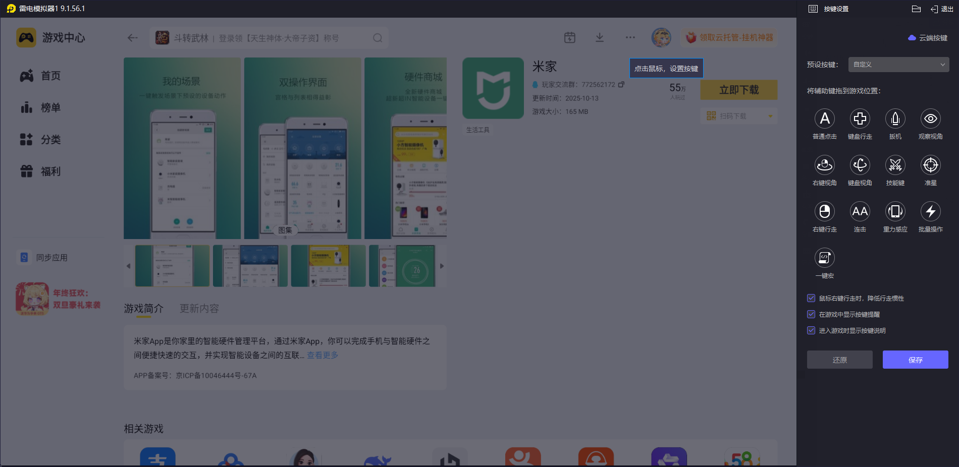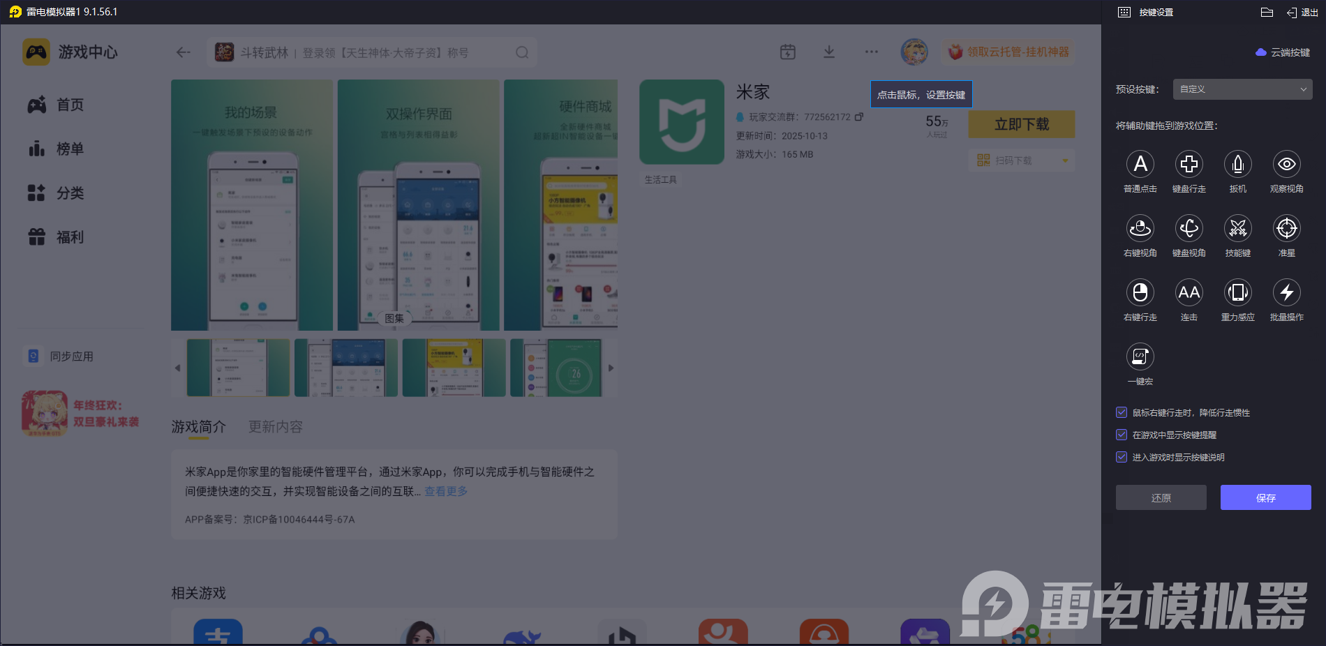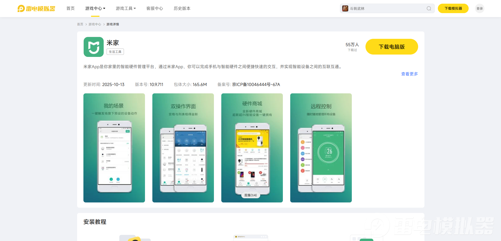 下载好雷电模拟器后,打开雷电模拟器内的“雷电游戏中心”,搜索“米家”即可下载米家电脑版。