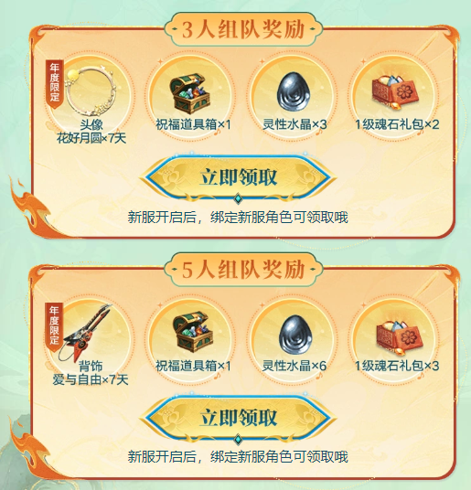 组队好礼等你拿!活动期间,完成3人组队或5人组队即可获得对应奖励,其中包括:年度限定头像:花好月圆*7天、年度限定背饰-爱与自由*7天、祝福道具箱、灵性水晶等好礼!
