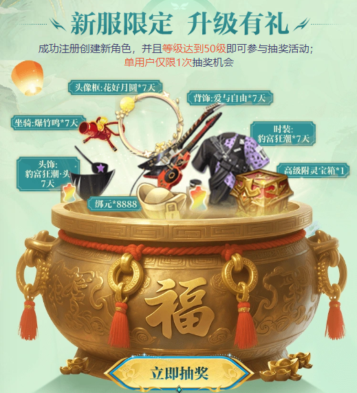 冲榜BUFF加码,福利再度升级!当修真者们成功注册创建新角色,且等级达到50级时,即可获得抽奖机会!时装:豹富狂潮、头饰-豹富狂潮·头、坐骑:爆竹鸣等超多精美外观以及游戏道具等你带走!