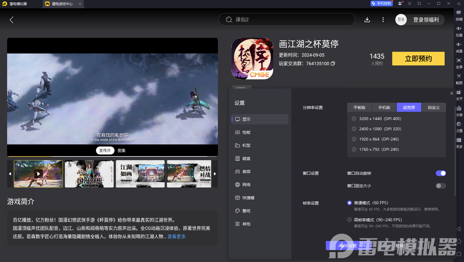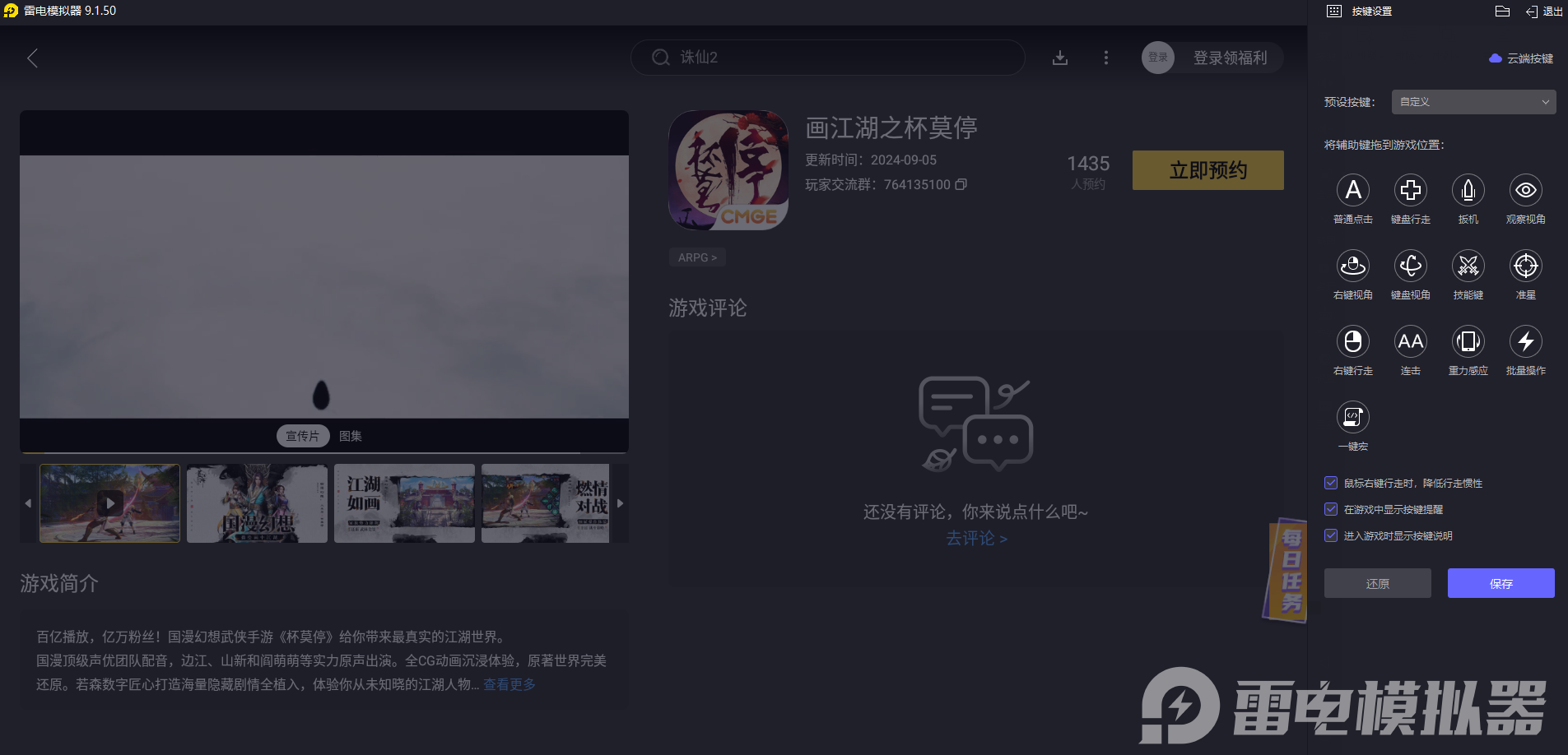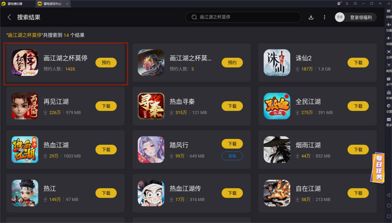 安装完成后,在模拟器的游戏中心搜索 “画江湖之杯莫停”,点击预约即可。这样就可以在游戏上线后第一时间收到提醒。