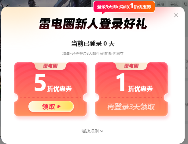 使用效果好我们肯定是想长期用的,刚好当下新用户福利也是准备丰富,在雷电圈注册完成之后,点击新手有礼,可以得到5折充值优惠券哦,坚持登录3天,还可以领1折优惠券,活动期为7天的,一定要及时领取哦。
