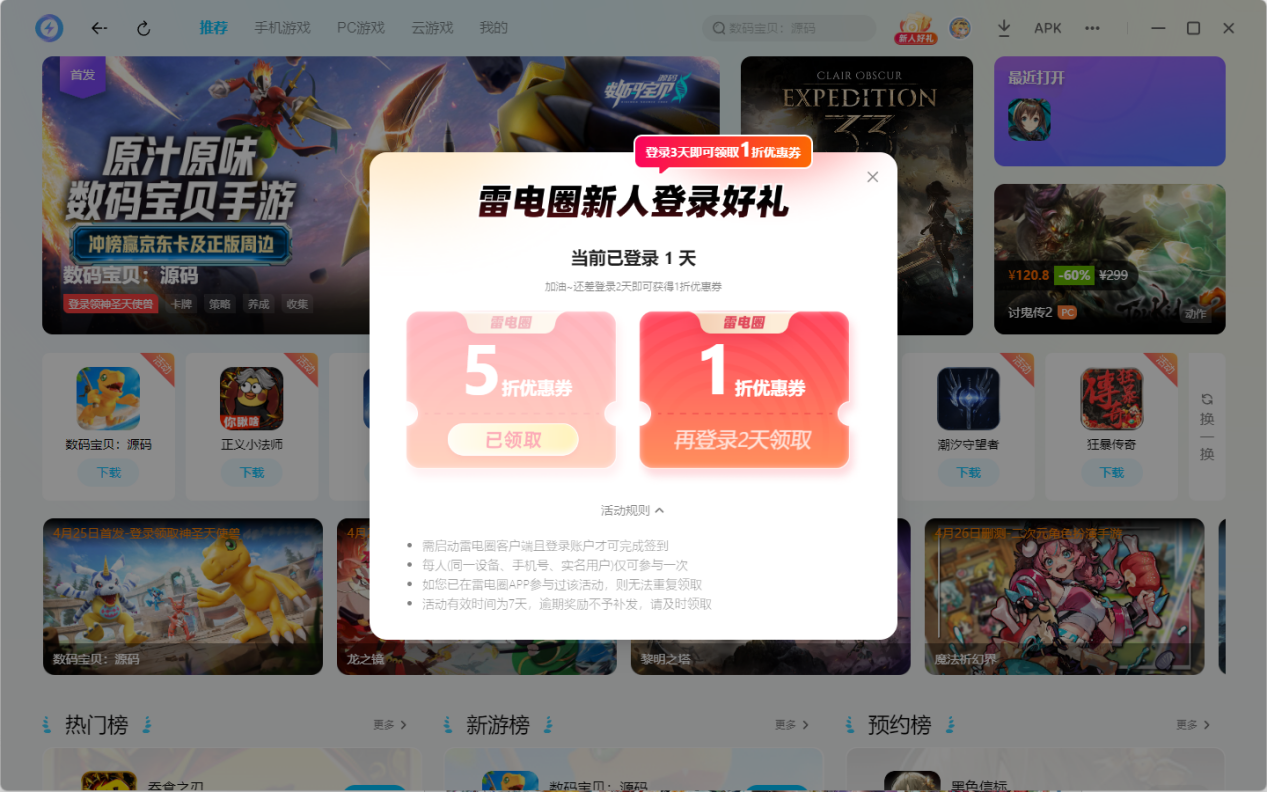 现在去使用也可去解锁超多的福利,其中新用户首次注册并登录可顺利领取到5折充值优惠券,此外大家累积登录3天还能获得1折充值优惠券,期间为7天,所以玩家到时候得及时去进行领取。
