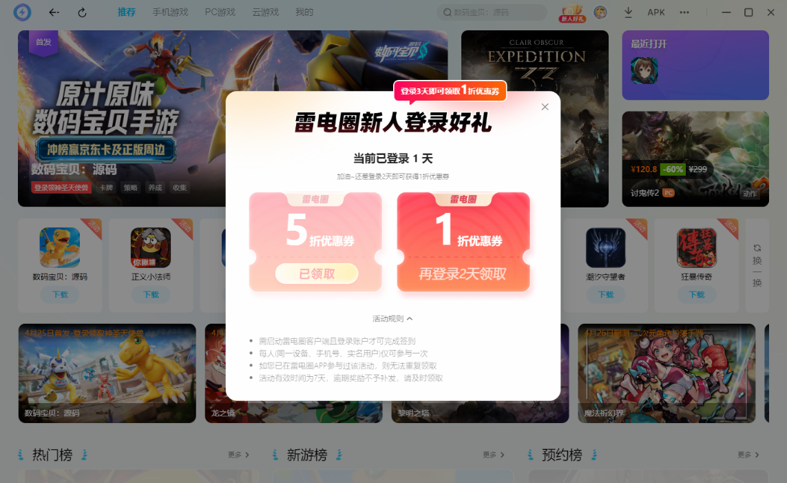 而现在各位去使用的话,作为平台新用户,首次注册登录可点击上方领取5折充值折扣优惠券,而连续登录3天更是能领取到1折充值折扣优惠券,该活动有效时间为7天,大家到时可一定不能错过了。