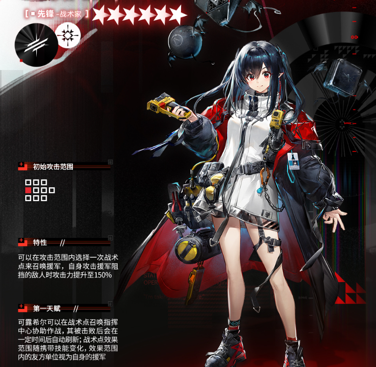 明日方舟可露希尔的职业是6星先锋-战术家,核心特性是可在攻击范围内选择一次战术点召唤援军,自身攻击援军阻挡的敌人时,攻击力可提升至150%。作为萨卡兹族的血魔,她延续了剧情中总工程师的设定,兼顾战场支援与战术调度,其天赋机制围绕援军召唤与费用调控展开,是七周年版本中极具特色的先锋干员,可适配多种阵容搭配,尤其在费控紧张的开局阶段表现突出。