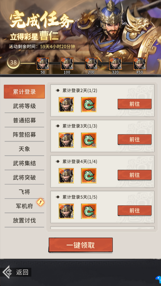 完成30日新手任务,即获SP名将曹仁,并直接升至最高品质“彩色”,即战力拉满。