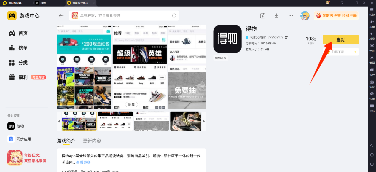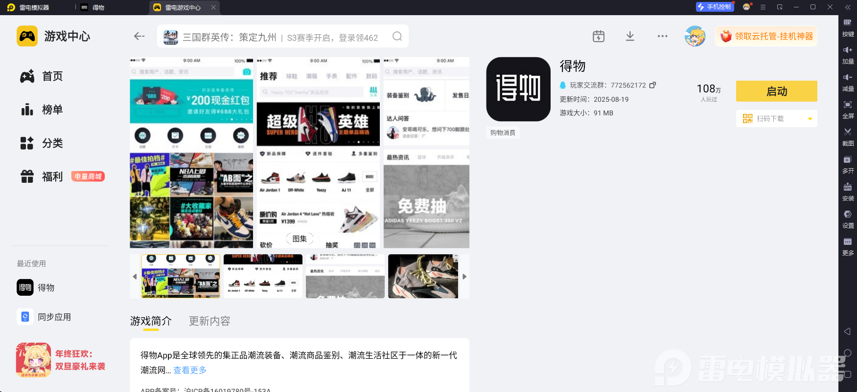 得物电脑版通过雷电模拟器实现功能拓展后,既保留了手机端的便捷性,又融合了大屏操作的高效性。无论是潮流爱好者日常刷货,还是商家批量管理商品,雷电模拟器的性能优化与多开功能均能提供有力支持。立即下载雷电模拟器,解锁得物电脑版的全场景购物体验吧!