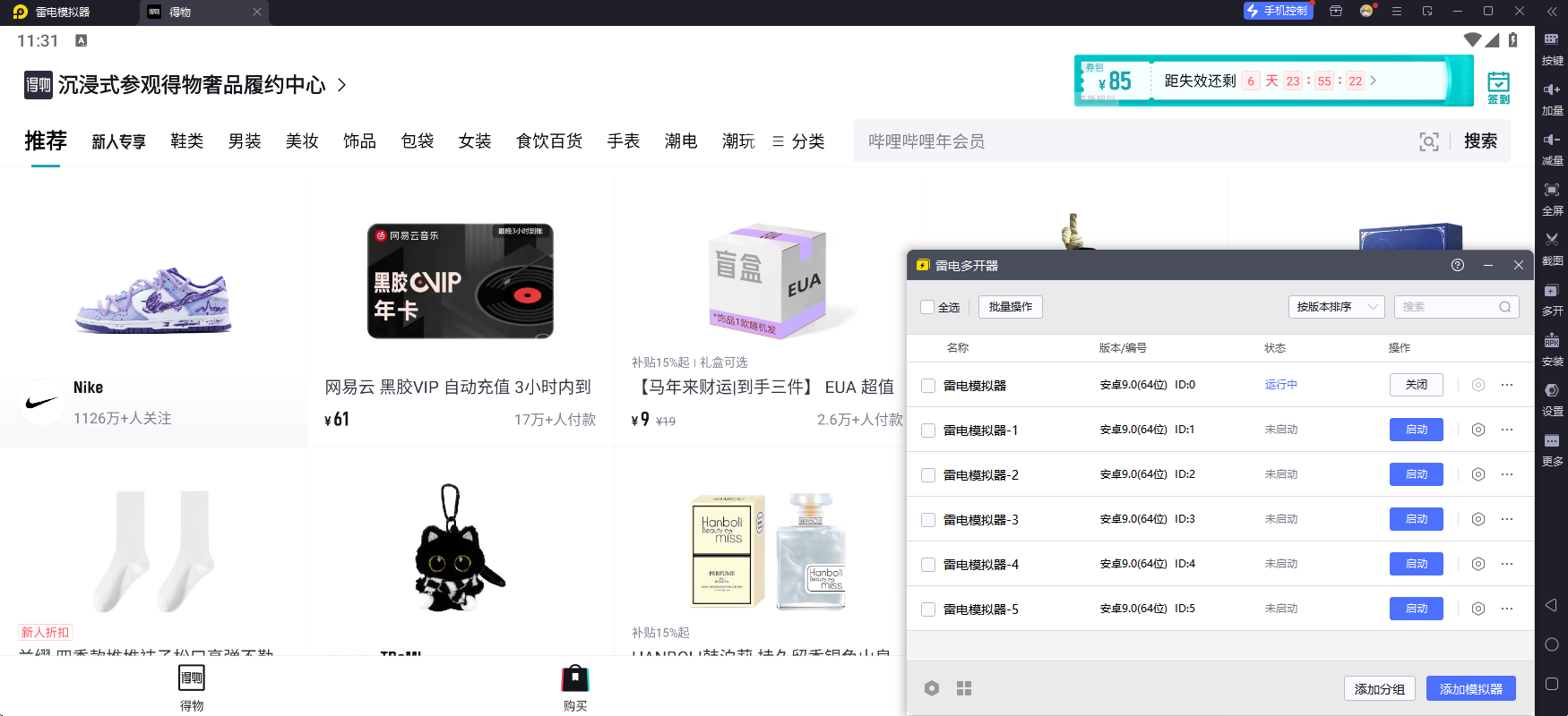 雷电模拟器的“批量操作”功能支持一键创建、关闭、排列多个得物窗口,并可同步控制所有窗口的滑动、点击等操作。例如,用户需对比10款球鞋的价格时,只需在一个窗口中滑动商品列表,其他窗口会自动同步滑动,无需逐个操作。