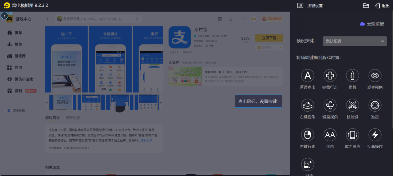 另外一个明显优势是雷电模拟器同时还支持键鼠操作,通过鼠标点击完成各种操作,比手机触屏更加精准。如果需要频繁进入某些功能,比如账单页面或转账页面,还可以通过快捷操作提高效率,对于经常在电脑上处理支付宝事务的人来说非常实用。