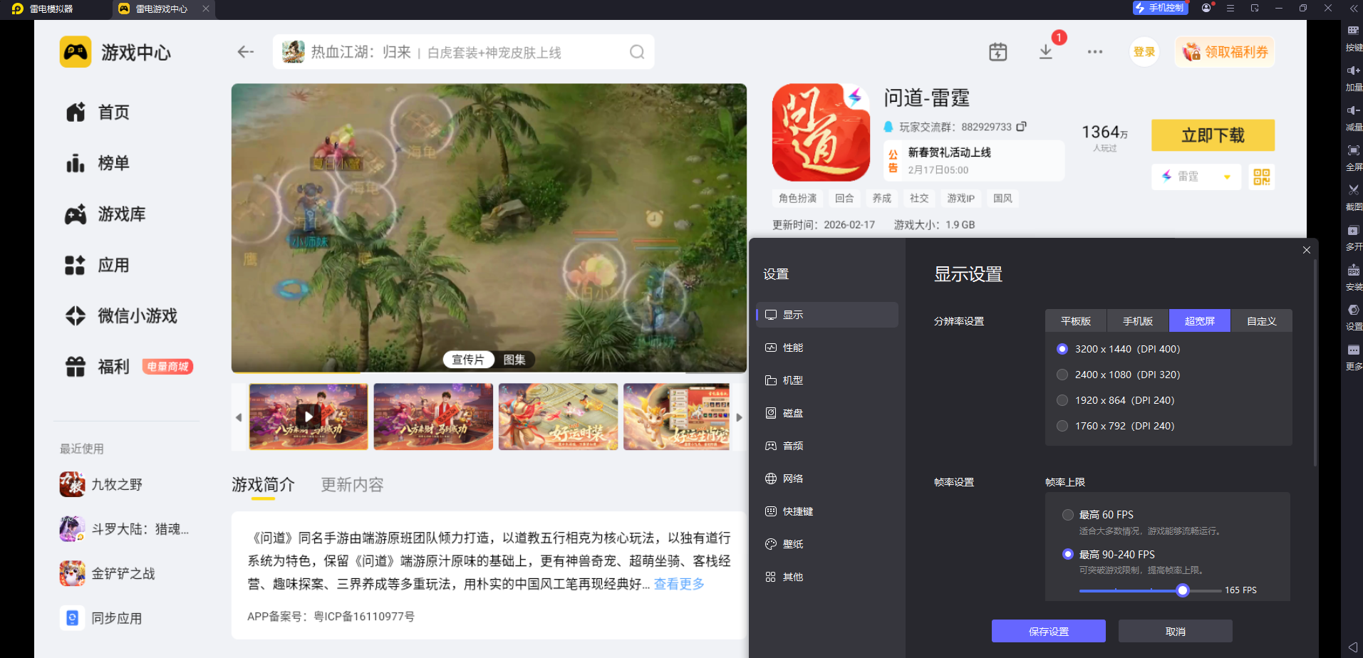 用雷电模拟器玩问道手游,画面表现十分出色。4K电脑大屏能完整呈现游戏里的仙侠风景、人物造型和技能特效,画质清晰细腻,每一处细节都能看得明明白白。相比手机小屏幕,大屏视觉体验更震撼,能让你更沉浸地感受问道手游的仙侠世界。