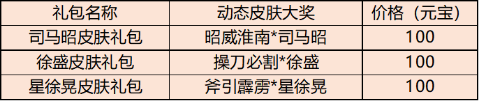 礼包限时购系列(昭威淮南*司马昭、操刀必割*徐盛、斧引霹雳*星徐晃)累计开启600个必中对应礼包的动态皮肤奖励