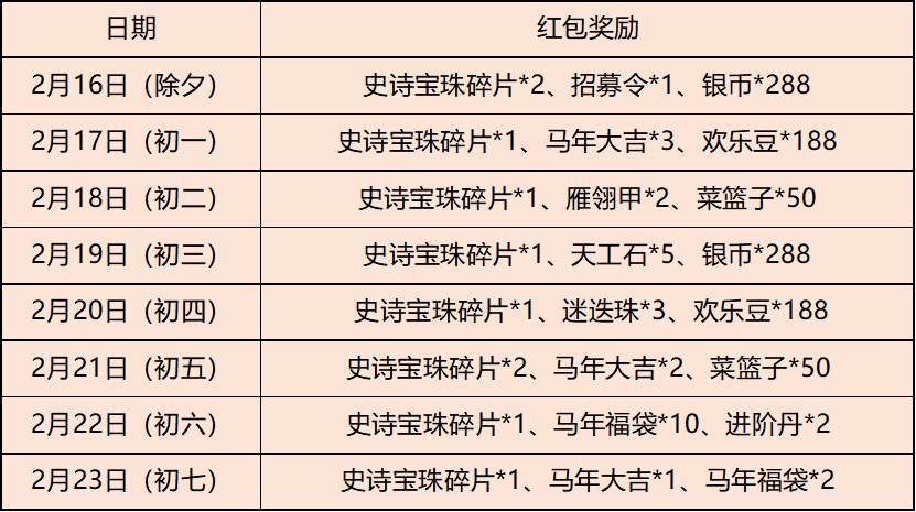 活动期间,累计可获得史诗宝珠碎片*10、马年大吉*6等丰厚奖励,需将客户端升级至4.5.2.0版本查看,具体奖励如下: