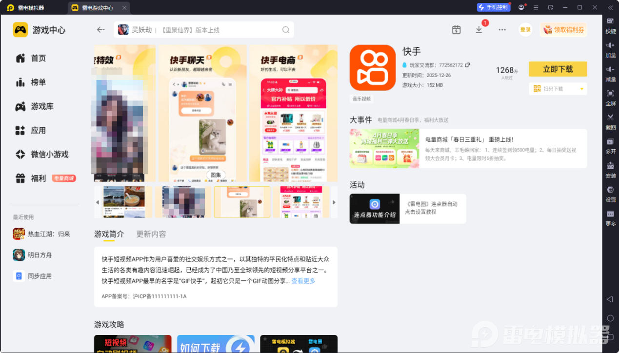 打开模拟器后,在 “雷电游戏中心” 搜 “快手” 或 “快手极速版”,找到对应的应用后,点击 “下载”,系统会自动完成下载安装。安装完成后在模拟器的应用列表中找到对应图标,就可以启动使用快手电脑版。