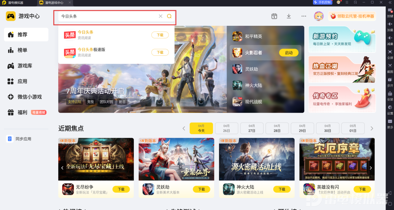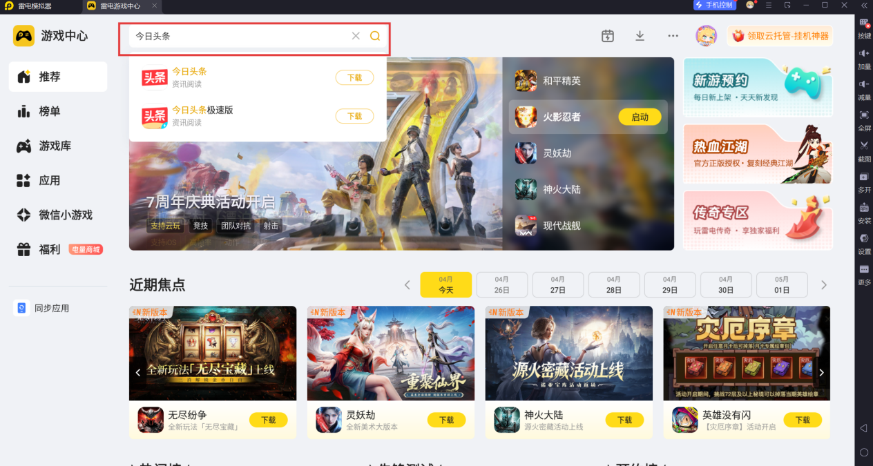启动雷电模拟器后,在自带的游戏中心或应用商店里搜索“今日头条”,找到后点击安装,稍等片刻就能在模拟器主界面看到今日头条图标,双击即可打开使用。其实,想充分发挥今日头条电脑版的优势,雷电模拟器是绝佳的搭档。