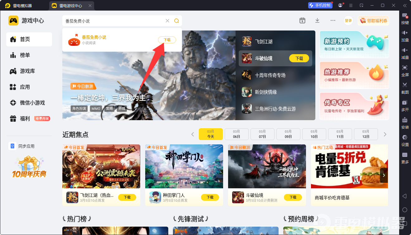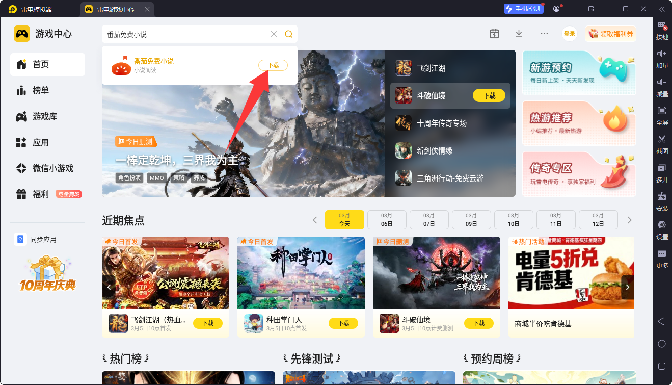 安装完成后启动模拟器,在内置的游戏中心搜索番茄免费小说,点击下载安装,安装完成后双击图标,就能打开番茄免费小说电脑版正常使用,全程无需专业操作,新手也能快速上手。