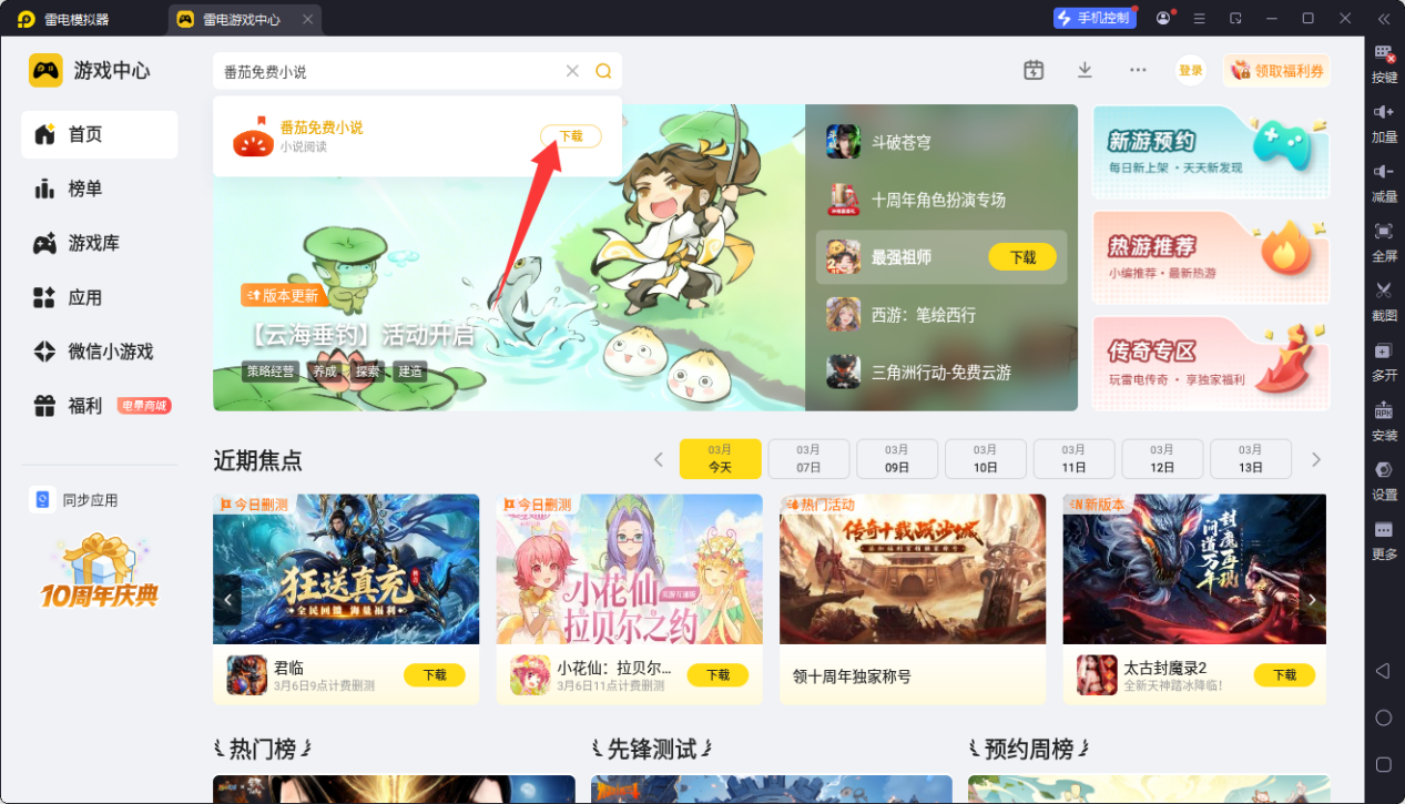 待模拟器安装完成后,双击图标启动软件,进入雷电模拟器内置的游戏中心板块,在顶部搜索栏搜索番茄免费小说,直接点击下载安装即可快速完成。