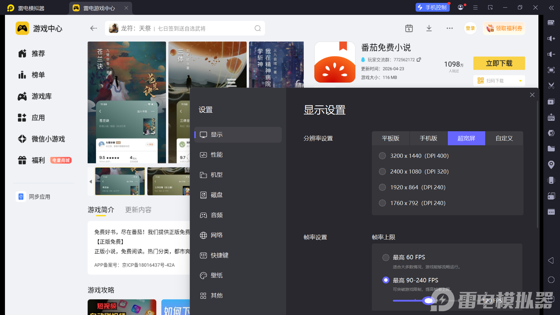 通过模拟器在电脑上运行番茄免费小说,能够大大提升阅读舒适度,这里推荐使用雷电模拟器。
