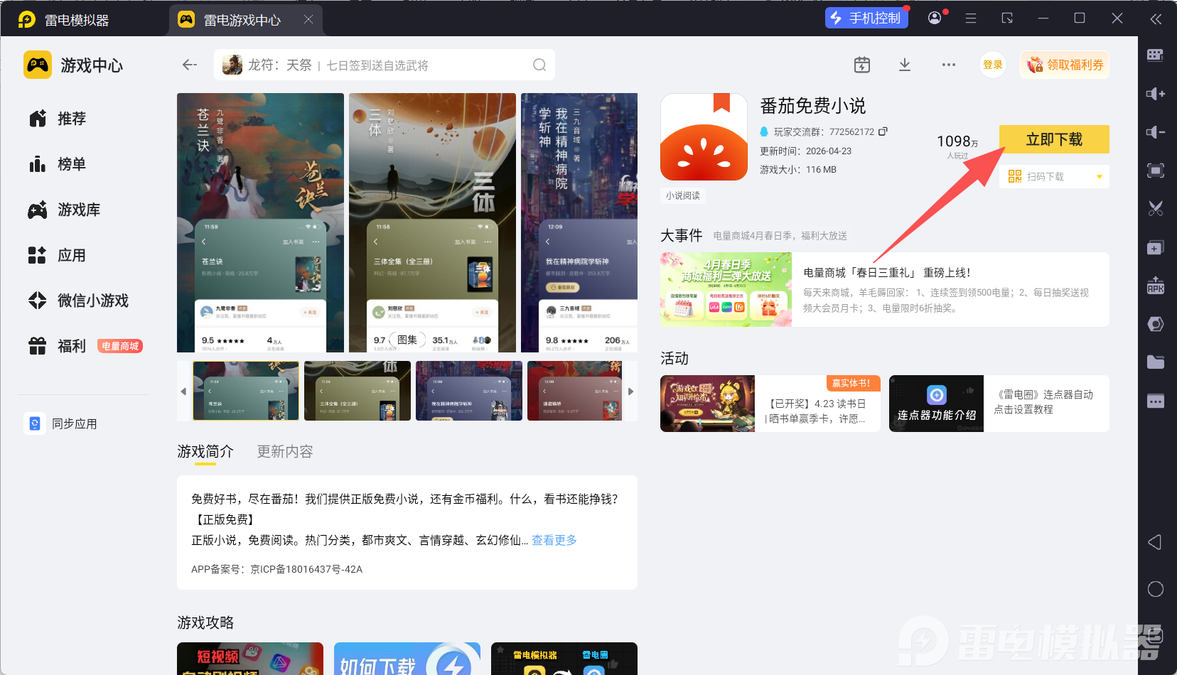 总的来说,想要更方便地下载和使用番茄免费小说电脑版,推荐使用雷电模拟器,还能拥有超清大屏、便捷操作的阅读体验,轻松开启沉浸式追更之旅。