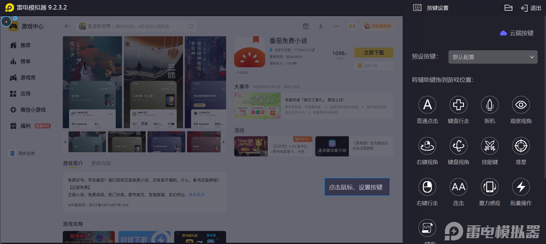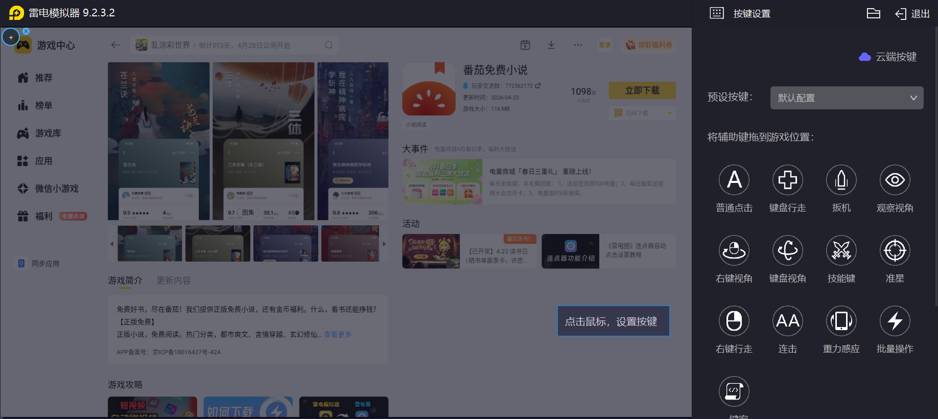 相比手机触屏操作,鼠标点击精准度更高,翻页、切换章节、调节字体大小、切换阅读模式均可一键完成,无需反复滑动屏幕。雷电模拟器支持自定义键鼠快捷键,可根据个人阅读习惯,将常用操作设置专属快捷按键,大幅提升阅读效率,让电脑端追更更流畅、更便捷。