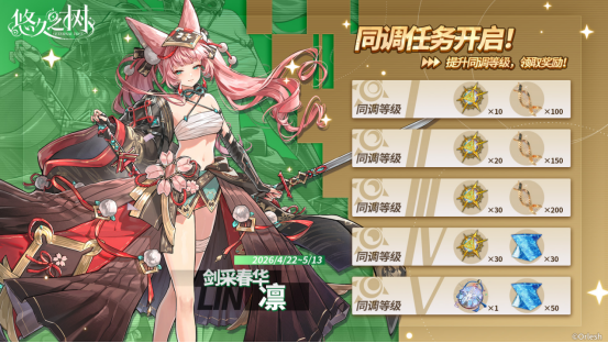 4月22日 维护后 - 5月13日 12:00,提升新角色「剑采春华·凛」的同调等级,即可获取耀金星徽等道具奖励!将同调等级提升至4级,总共可获得耀金星徽×90。将同调等级提升至5级,可获得银色誓言×1!