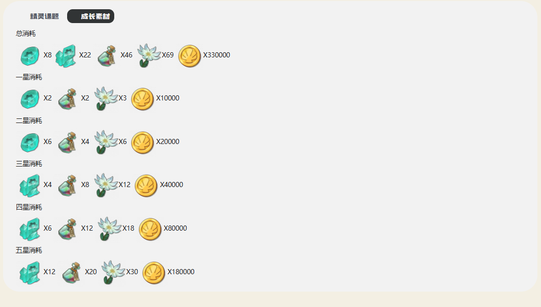 想要培养这个精灵需要各位收集8个机械系灵碎、22个机械系灵石、46个魔法粉尘、69个天使草和33万金币,需要的素材大概需要2-3天收集完毕,自己世界同属性的精灵消耗的素材多的话可以前往其他小伙伴的世界收集。