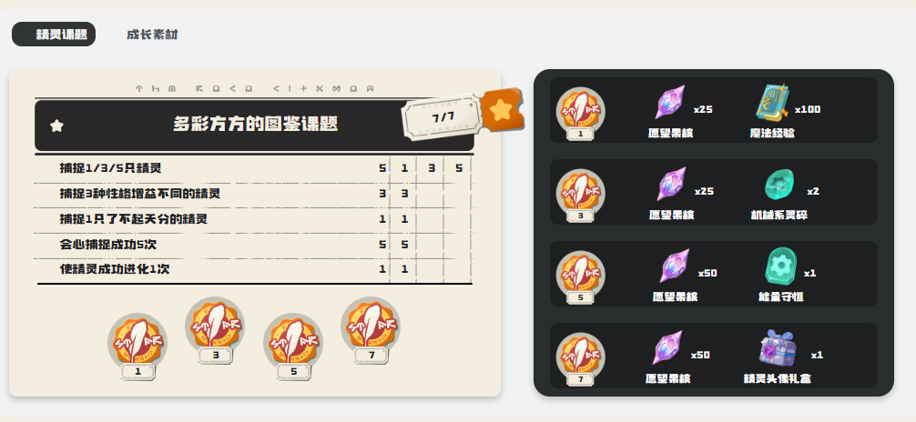 完成这个精灵的培养课题可以收获100个愿望果核,100魔法经验、一个机械系灵碎、还有一个能量守护的技能石,最后还能获得该精灵的头像。