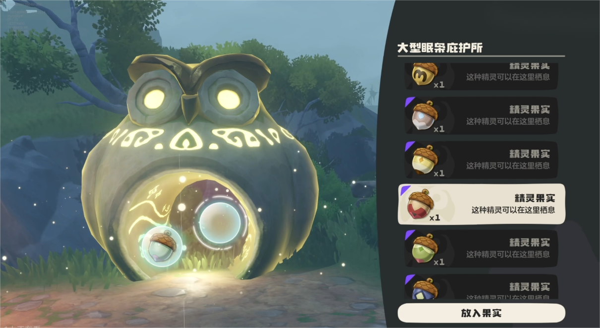 1、来到眠枭庇护所,点击庇护所会让各位玩家,选择果实,大家选择下图所示的精灵果实可以刷到骨龙的初始形态大头骨龙,提升等级之后就能进化为寂灭骨龙,展现帅气的一面。